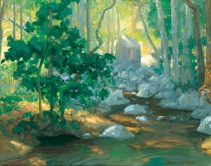 Peter Adams was describing one of the paintings in his current exhibition at the Hollis Gallery. Titled “Hidden Pools of the San Gabriels,” this collection of recent oil paintings, executed on board, was created au plein air over a period of some four or five months