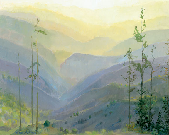 For although Adams has studied in the plein air tradition and works on site, he has his own unique approach to painting California mountains and the California coast.