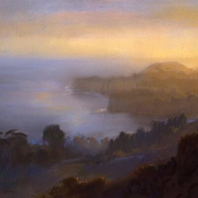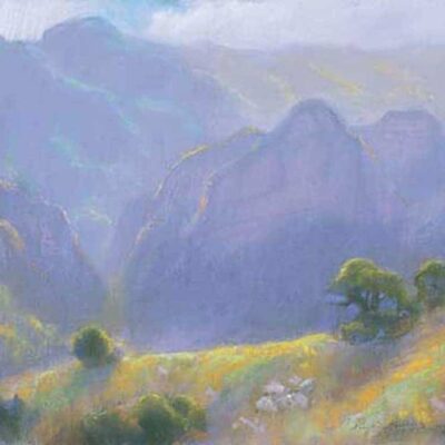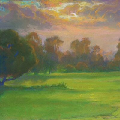“Peter Adams is one of California’s premier realist artists. He is also a romantic, who proudly continues a nineteenth-century ideal of painting as an expansion of our vision and emotions. Like Delacroix and Degas, masters of pastel, Adams uses the medium with astounding sensitivity. He prefers to work on location, so he is fully immersed in the scene. Typically he begins a pastel using broad sweeps of chalk. This initial lay-in of color is expansive, vibrant, and often resembles an abstract composition. As he continues to work, he defines features, capturing subtle nuances of form and tone. Peter likes to use his fingers in tandem with his chalks. Reserving one finger for each color group—red, green, yellow, blue—he gently rubs and works his pastels to create a dynamic range of effects. By building color and modulating edges, he is able to create the illusion of open air and solid mass, near and far, brilliant light and rich darks. Like the best romantic art, these pastels capture a scene but also transport you to a place that is wondrous and unforgettable.”