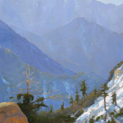 “The San Gabriel Mountains are just ten minutes from where we live in Pasadena. I feel so fortunate to be able to quickly get out of the city and into wilderness. All throughout these mountains, which peak at 10,000 feet, are countless points of interest, magnificent vistas, and an abundance of natural beauty. Hiking in the San Gabriels, I’ve come across all sorts of evidence of man’s productivity, including abandoned gold mines, neglected bridges, and remnants of what was once a grand funicular that led up to a fashionable lodge, hotel and, even a zoo. In this photo, we are on top of Mt. Wilson where one can find giant radio antennas and the Carnegie Observatories, including solar towers and a 100-inch telescope. Here, my wife Elaine and I are hiking our way up to Echo Rock from where I plan to do some painting of vast canyon vistas. Of course, our dogs are with us for encouragement.”