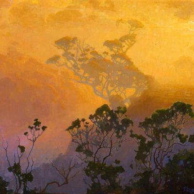 “Much of Peter’s art evinces inspiration of Oriental design: the distinct shapes of his trees reflect his training in bonsai, and his use of large aesthetic shapes to depict fog or cloud reflect similar uses of negative form in Oriental Painting.”