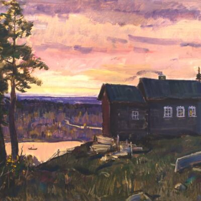 In 1991 Petrov-Maslakov visited Alaska for three months and created a series of paintings depicting historic events in the 18th century Russian settlement of Novo-Archangel in Sitka. White Nights and serene landscapes of northern lands in four seasons are among the favorite themes of Petrov-Maslakov’s art. His paintings, always authentic in details, are also symbolic in meaning.