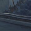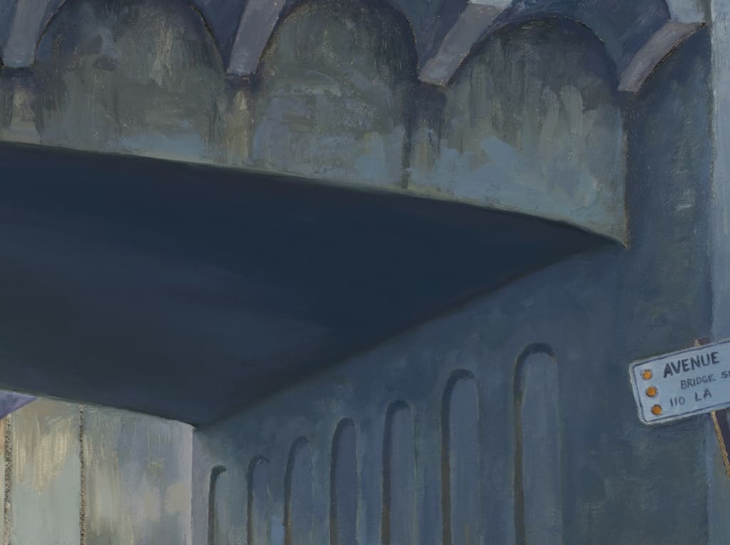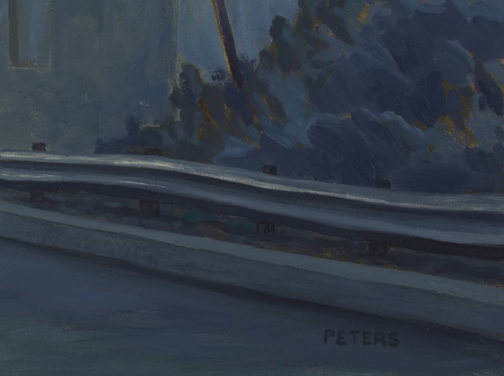Tony Peters's fascination for freeways is metaphoric. Freeways are an integral part of life in Southern California as these busy highways connect like concrete arteries. To Peters, they symbolize life's journey filled with decisions. In "110 Freeway Bridge," the artist brings attention to the curves in the architectural details and the cut-off directional sign that warns us of impending curves, however, the outcome is not known. The sign to the right tips toward the direction of the tunnel and draws the traveler further into the scene.