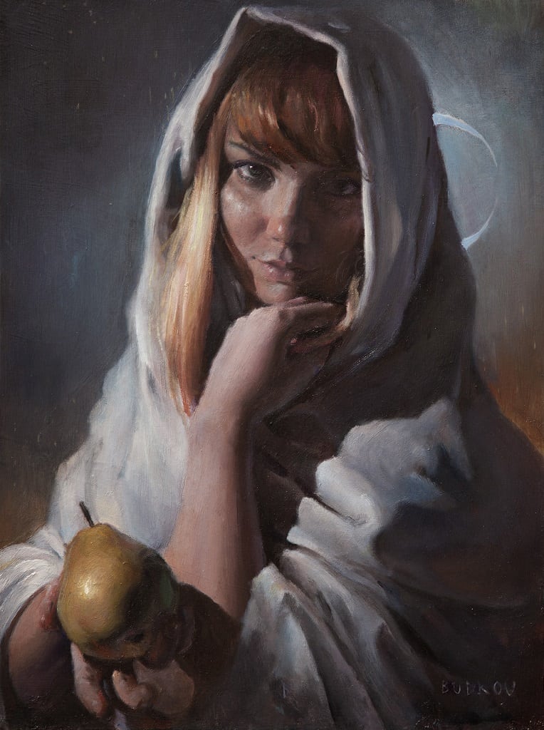 "With a mysterious crescent behind her, the woman hides half of her face in the shadow of a cloak. Playing with her hair and offering a pear symbolizing wisdom, she seems to be the guardian of some dreamy imaginative realism."