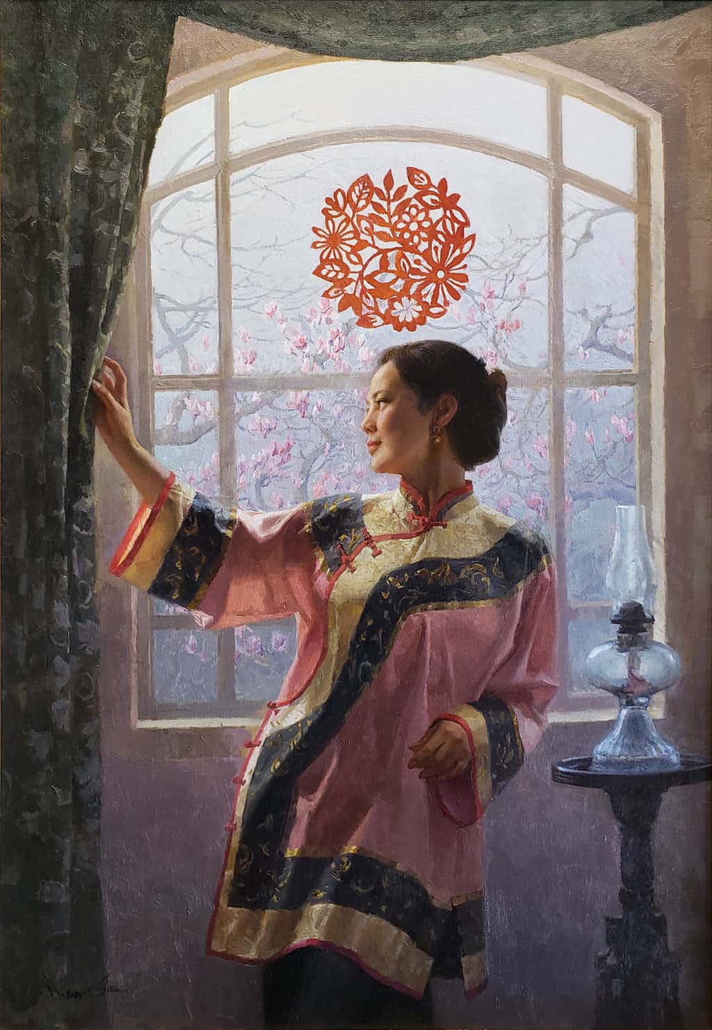 "A Chinese lady looking out of her window enjoying the magnolia blossom in Spring. Her window is decorated with a piece of Paper Cutting art. Because of its affordability, paper-cutting became one of the most important types of Chinese folk art. the cut-outs are often used to decorate doors and windows."