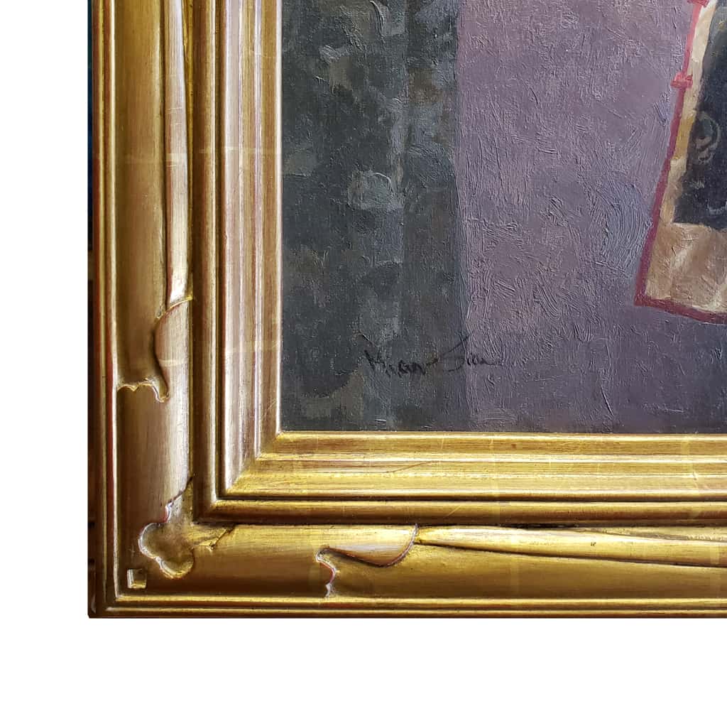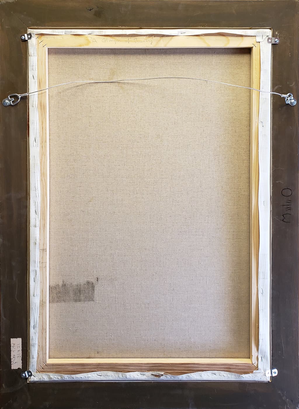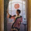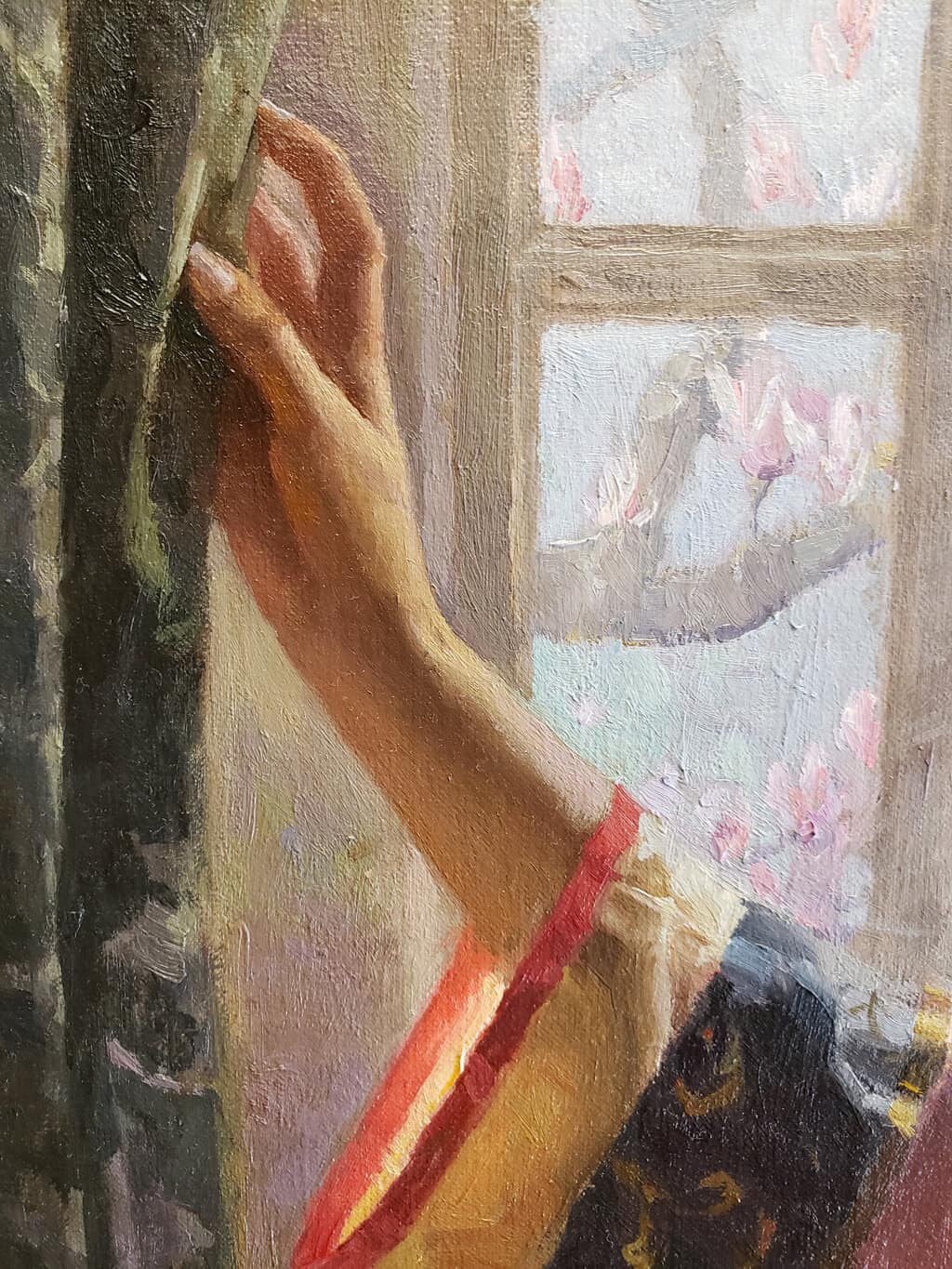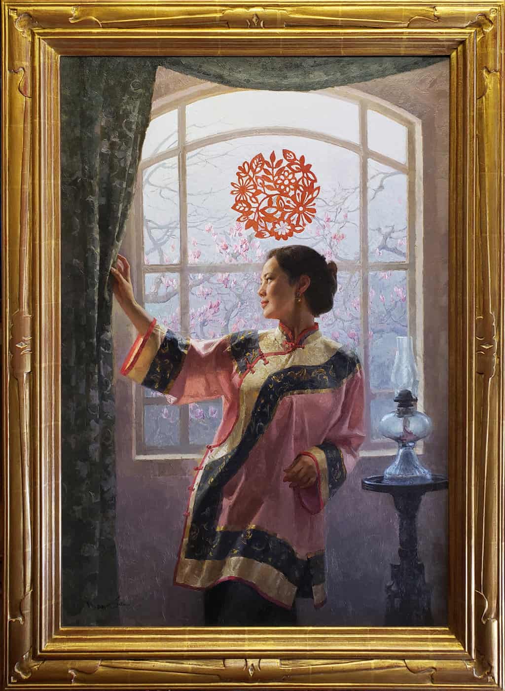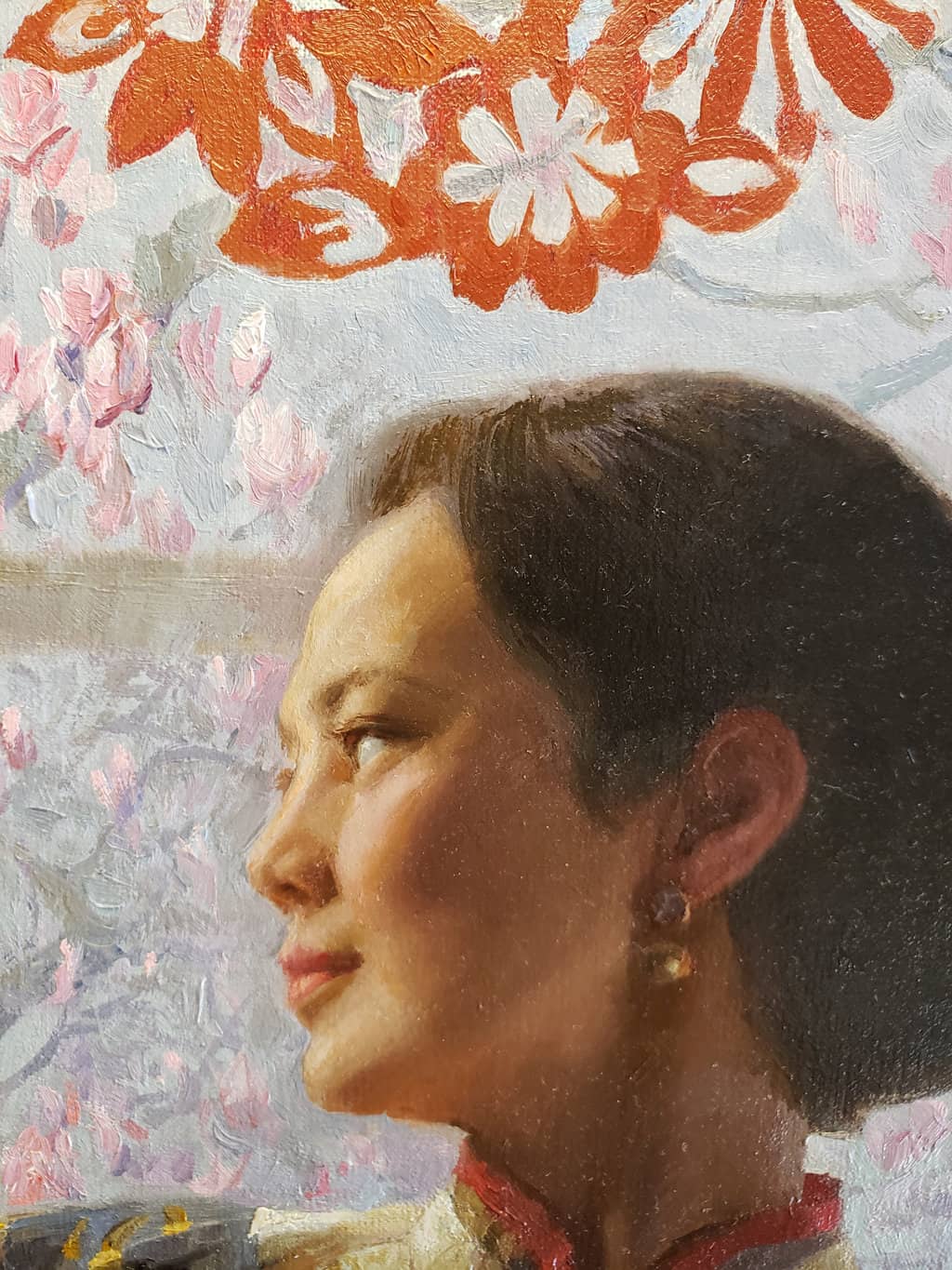 The artist portrays his wife, Gloria, in an elegant and refined setting. Her sinuous pose and assured profile project a sense of beauty and confidence. The drape of her pink silk robe hearkens back to her Chinese ancestry and its contrasting embroidered border creates a diagonal line that exudes a feeling of strength. Outside is cool and fresh, the beginning of spring; and the Glimpse of Beauty is viewed from either side of the window.