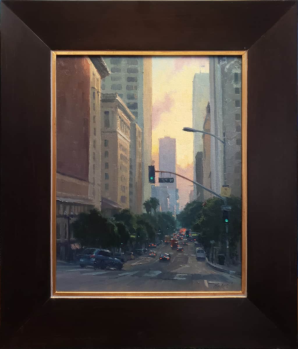 "Approaching Fifth Street heading south, Grand Avenue descends from Bunker Hill, giving a nice view of the traffic heading downtown, especially in the evening when the tail lights sparkle."