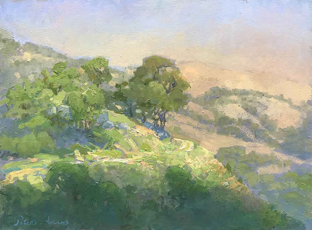 This oil painting was created en plein air from the interior of Tejon Ranch, California in the southern San Joaquin Valley, and shows a pristine California landscape with rolling hills and oaks. Tejon Ranch was founded in 1843 and consists of 270,000 acres, including 10,000 acres of the Pacific Crest Trail.