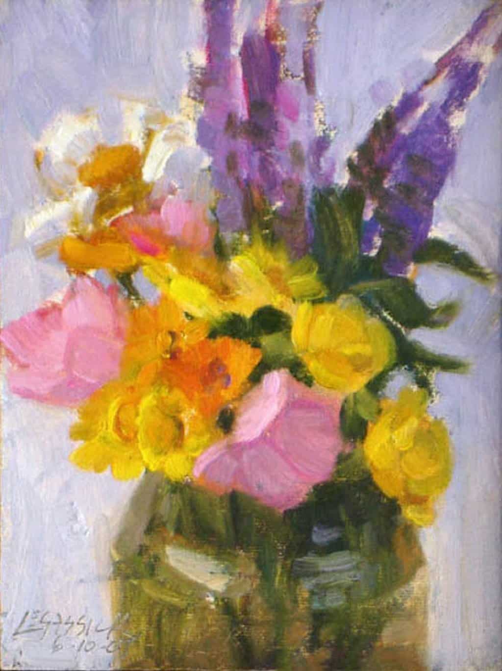 This painting was created alla prima as part of Jean LeGassick's "Daily Painting" project. The California flowers are the first blooms and first picks from the artist's garden.