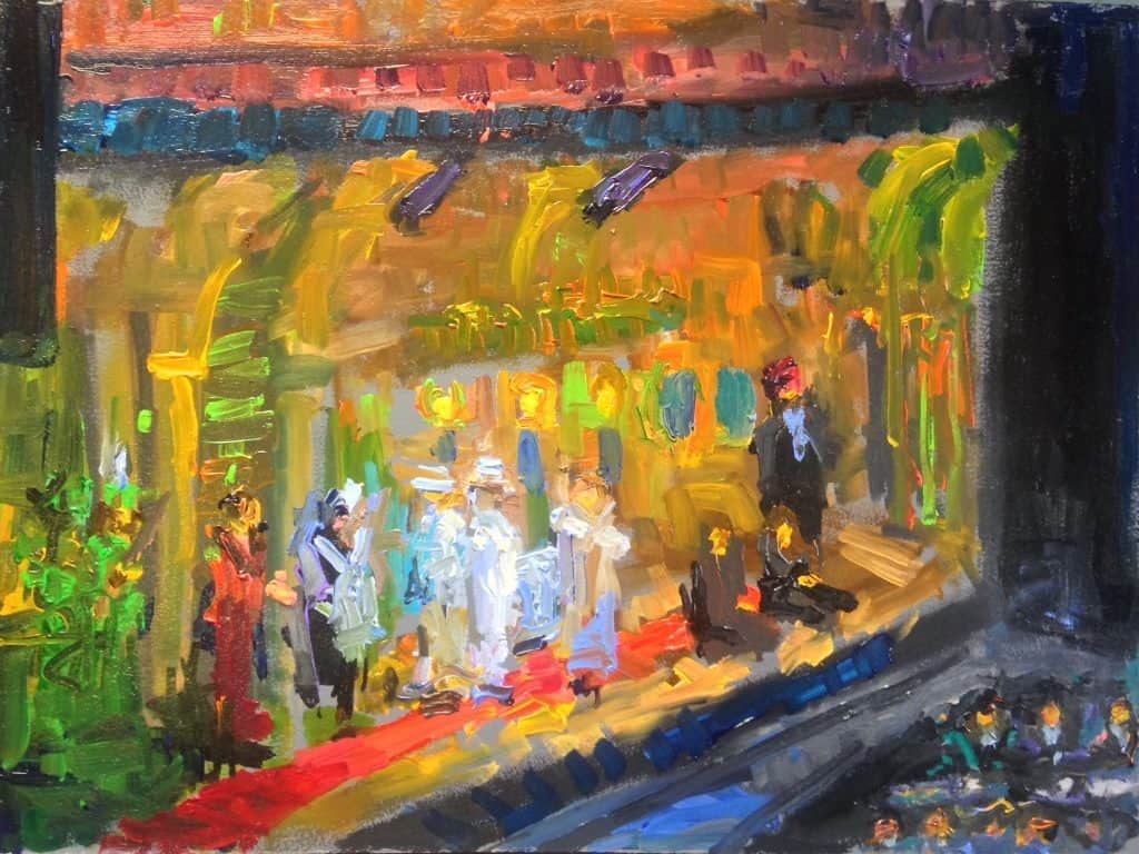 Painted at the Los Angeles Opera by special arrangement. While seated in an engineers' box and using only one small reading light, Peter Adams painted this final scene all prima from Mozart's "The Abduction from the Seraglio." The staging was set aboard the Orient Express in the 1920s.