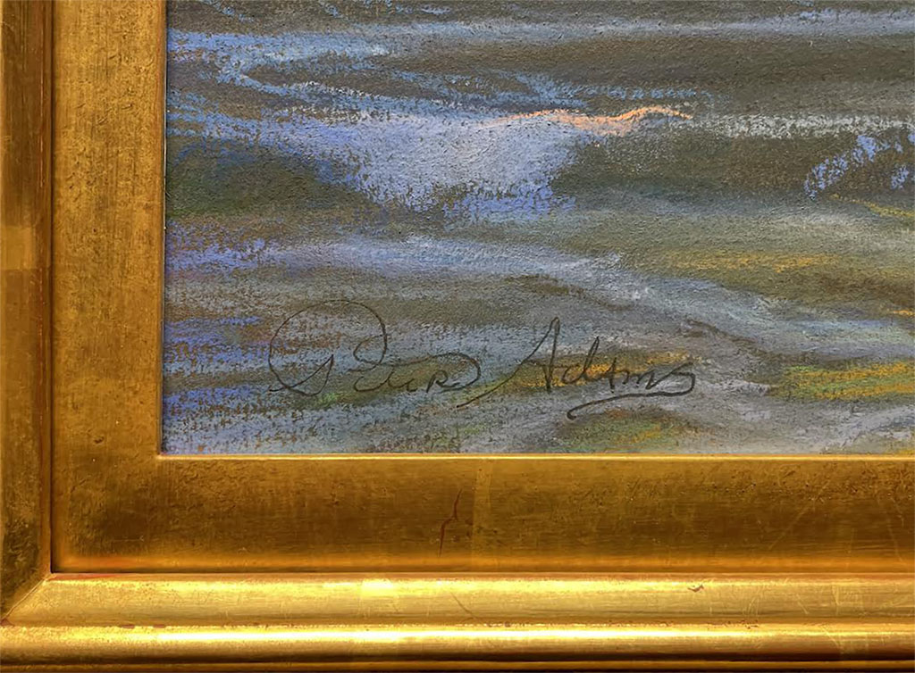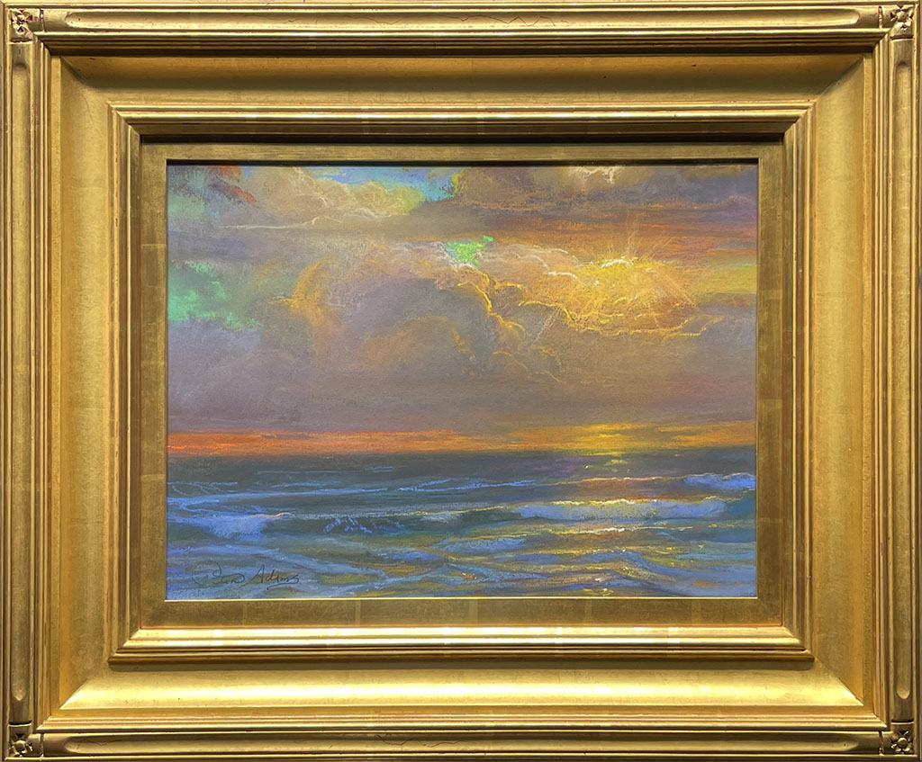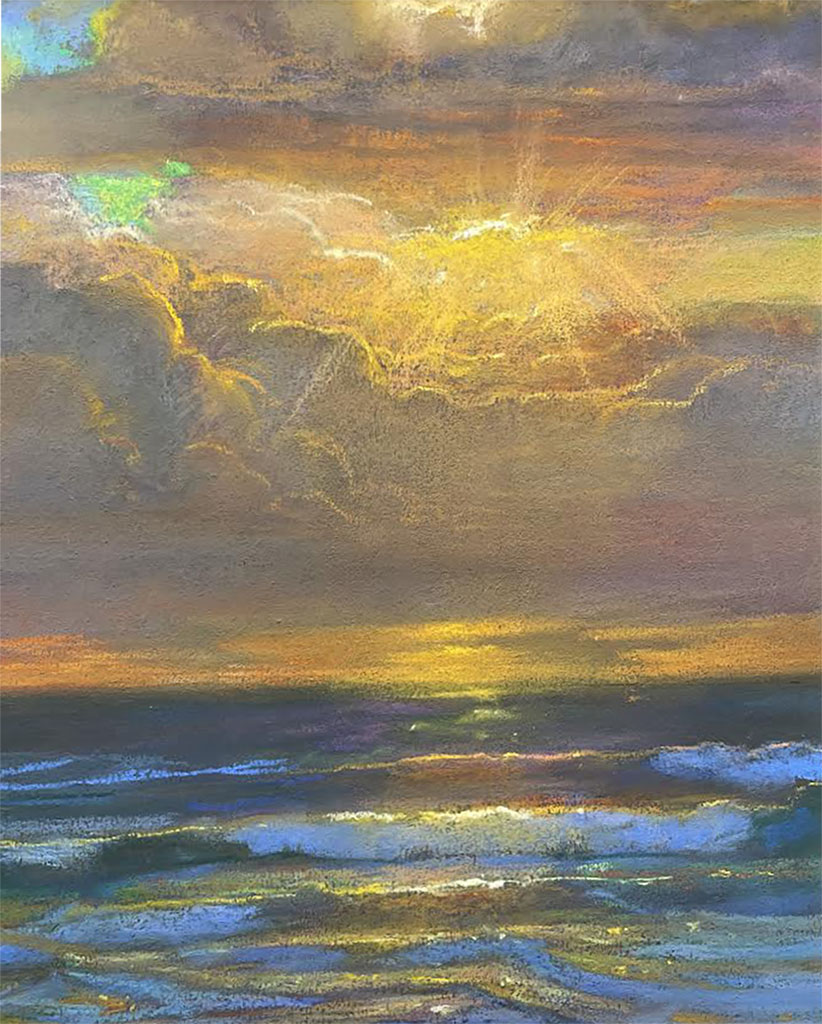 “It is always exciting seeing the remnants of a storm rolling out to sea knowing that the next day will be full of sunshine and warm weather. I have tried to portray a feeling of hope in the midst of clouds at the end of the day. This work painted en plein air in pastel in front of our beach house in Oceanside, California after a long storm in October of 2023.”
