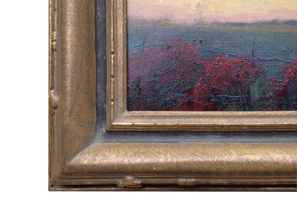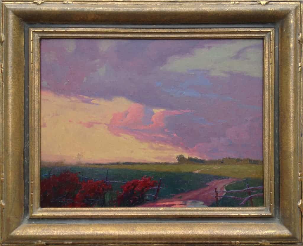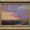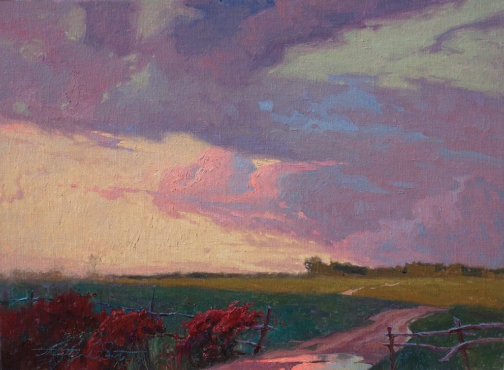 "The poetry of the passing clouds dramatically looming over a field surrounded by bougainvillea just outside my studio in Carson inspired this contemplative scene of the end of summer. The painting represents an homage of sorts that reflects the beauty of California's landscape and the compositional sense and tranquil mood of paintings I recently experienced at the Tretyakov Gallery in Moscow."