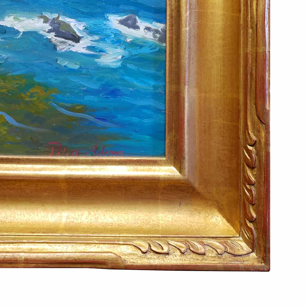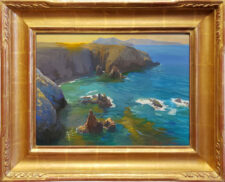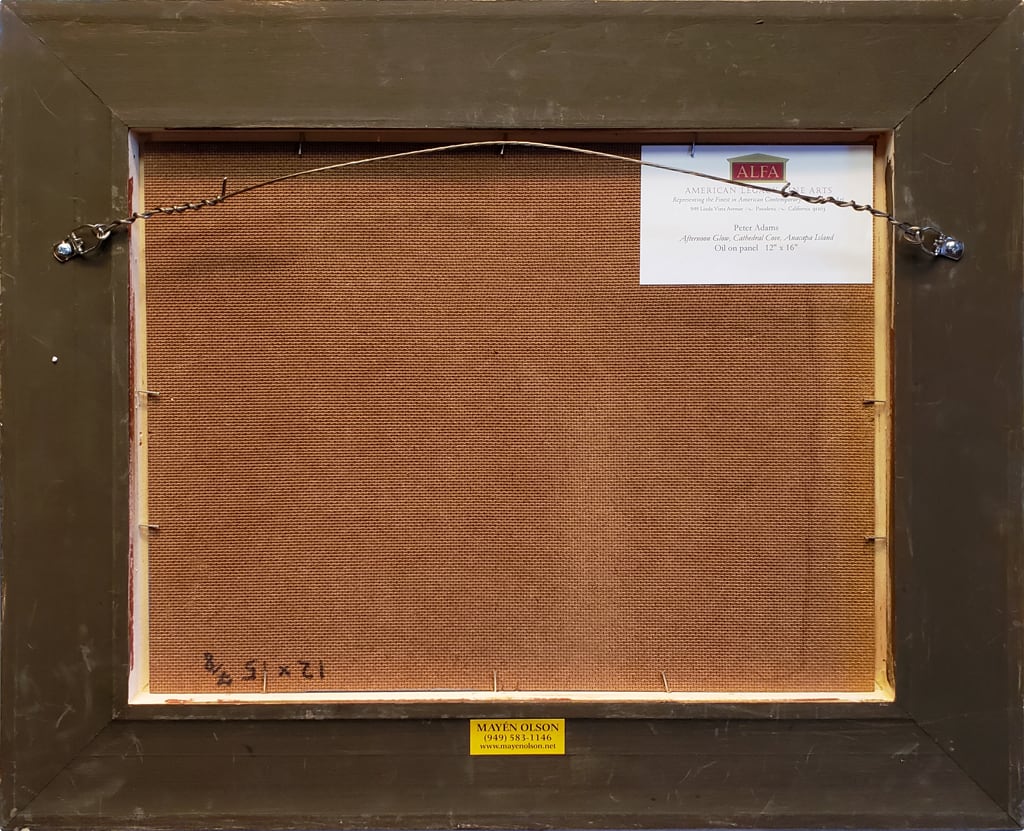 This plein air oil painting depicts the uniqueness of Anacapa Island in the chain of Southern California’s Channel Islands archipelago. Anacapa was formed by volcanic eruptions. Its desolate landscape is dominated by distinct geology of steep precipices and jagged rock formations. From this elevated viewpoint, Adams portrays the location known as Cathedral Cove with its outcropping spires and massive kelp beds that hug the shoreline. The peak of the middle island of Anacapa is visible in the distance, and further out to sea is Santa Cruz Island. Anacapa Island is located in Ventura County about eleven miles off the coast of Port Hueneme and is within the Channel Islands National Park.