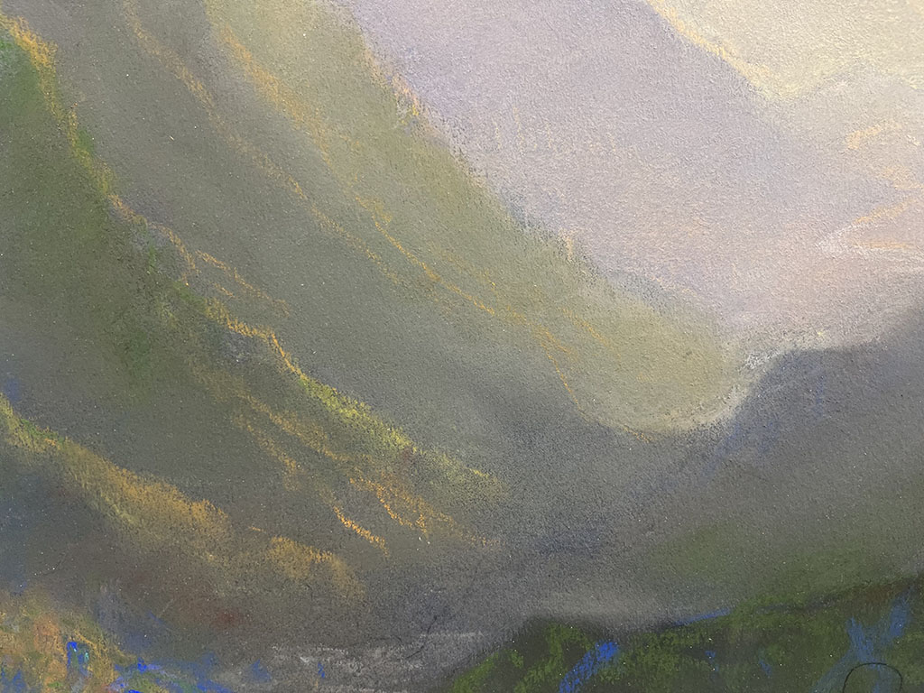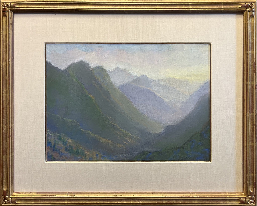 “In the late afternoon, this is one of my favorite spots to paint from in the San Gabriel Mountains. It overlooks the headwaters of the Arroyo Seco River. I’m perched on the road to Mount Wilson by Mount Disappointment and looking westward to the slopes of Strawberry Peak, Brown Mountain, and Mount Lukens. The precipitous cliffs remind me of the mysterious Sung and Yuan Dynasty scroll paintings of ancient China.”