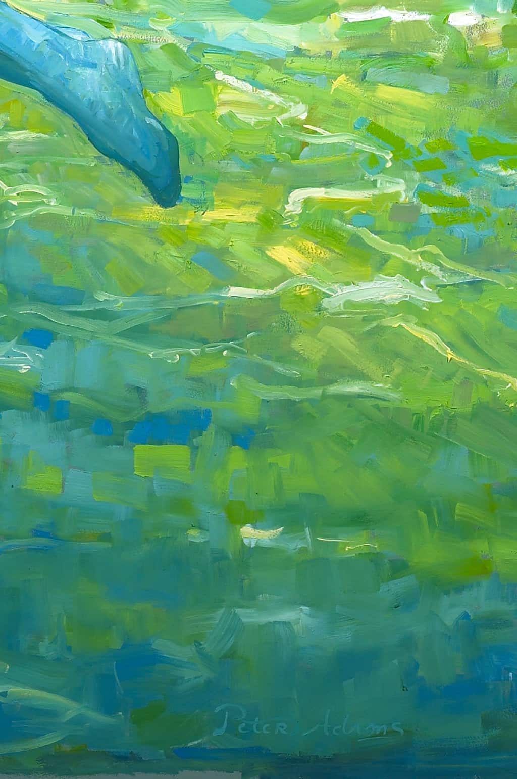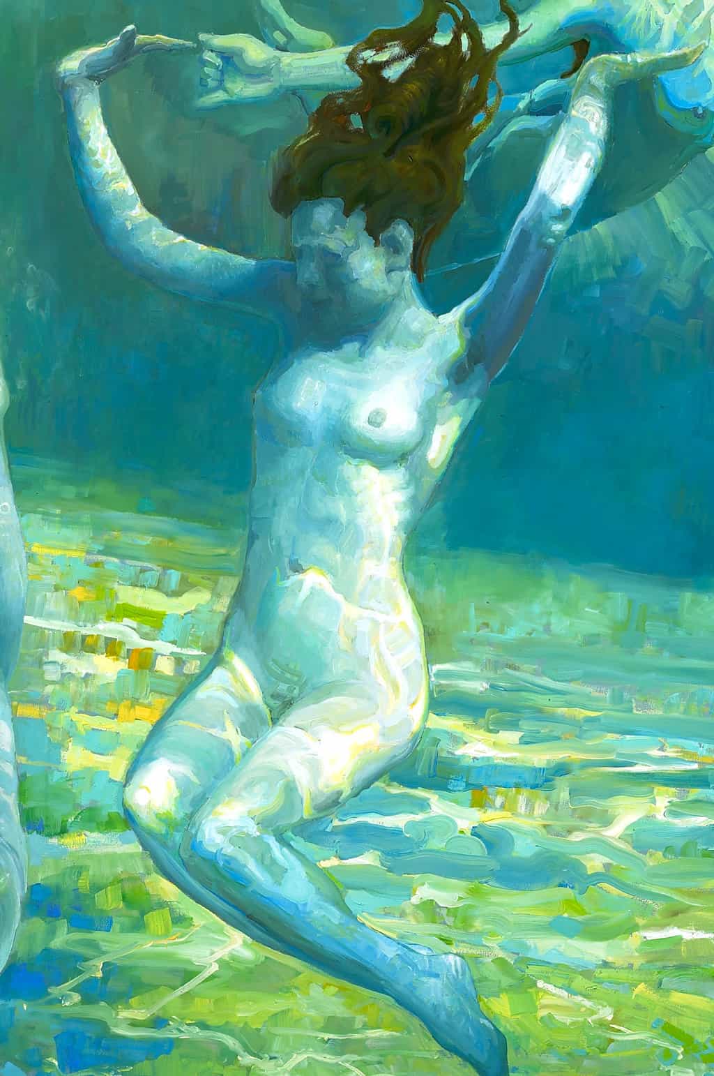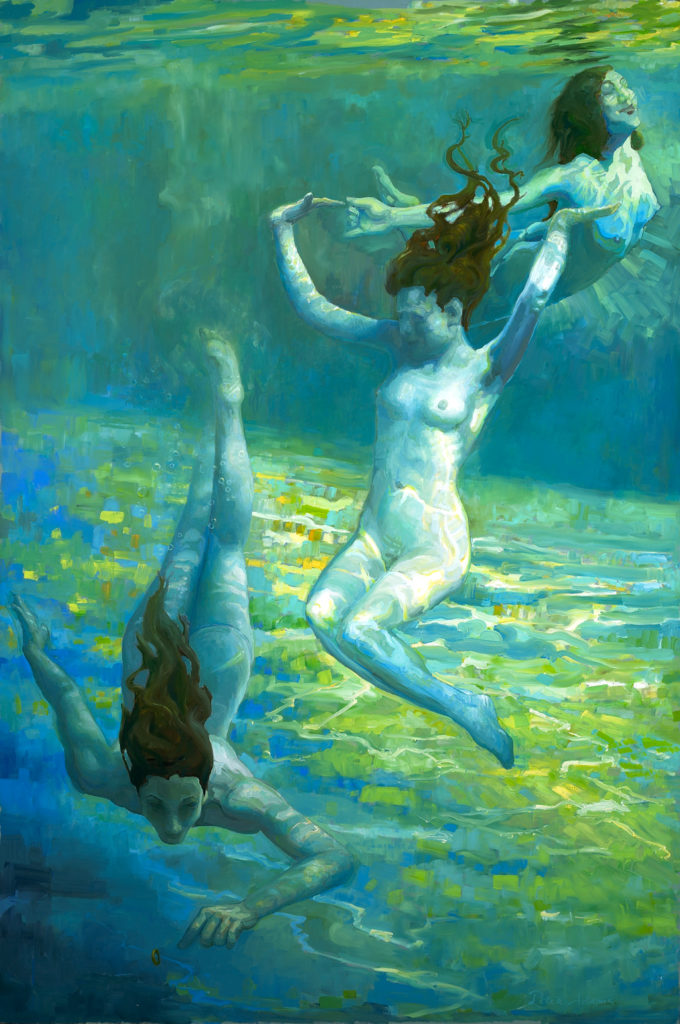 "Alberich’s Vision is inspired by Richard Wagner’s four-opera saga, The Ring of the Nibelung. The story is a timeless tale of greed and power. In my interpretation, Alberich, while swimming underwater in the Rhine, sees the three maidens illuminated by prismatic light and is immediately captivated by their alluring beauty. However, he soon spots the mountain of gold that the Rhine Maidens are guarding and decides to forswear love and beauty in favor of stealing it. He forges a ring from the gold, which possesses magical powers, and whoever wears it can control the universe. Ultimately, the immense power proves to lead to misery and destruction—and finally, the ring is thrown back to the Rhine Maidens who retrieve it. Thus, power is deceptive, but love and beauty endure."