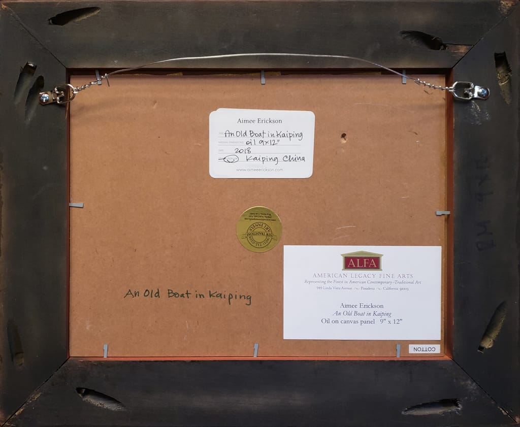 Aimee Erickson Archives Biography Press and Publications View in Room Sizing is approximate. See specs for exact dimensions. Twitter Email Aimee EricksonAn Old Boat in KaipingOil on canvas panel9" x 12", artwork13.5" x 16.5" x 1.25", framedContemporaryNot AvailableRequest More Information Provenance Acquired by American Legacy Fine Arts directly from the artist Exhibited China's Crown Jewel; Recent Paintings by American Artists, American Legacy Fine Arts, June 21 – July 28, 2019 Need help? Call our ALFA specialists +1 626.577.7733
