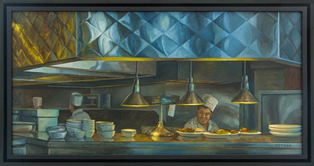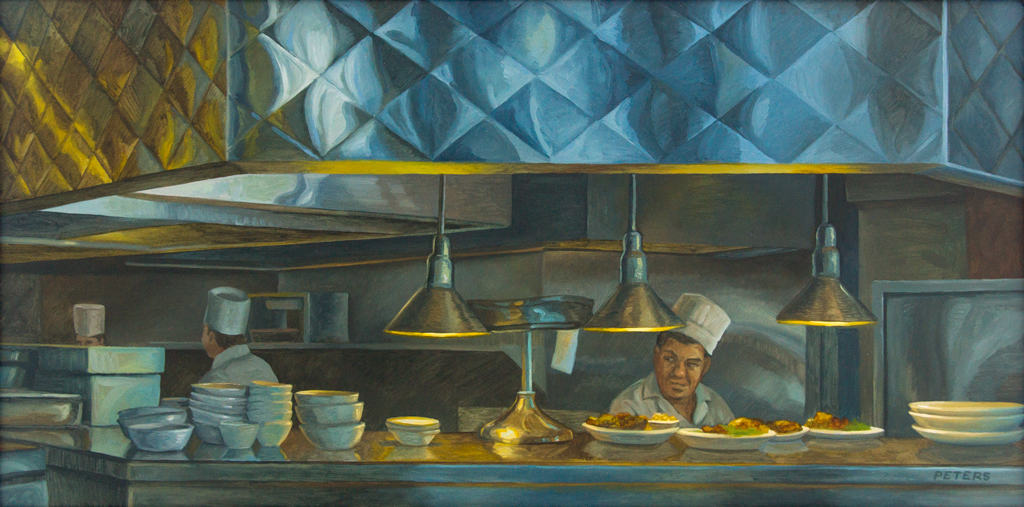 "The chef at work is in a state of 'flow' also known as 'the zone.' A mental state of operation in which a person performing an activity is fully immersed in a feeling of energized focus. Characterized by complete absorption in what one does, it can be the ultimate experience of harnessing emotions in service of performance. I wanted the diamond pattern in the stainless steel to represent the day-in-day-out repetition in which this worker does his job. Making it a kind of mastery in progress. This moment of absorbed work preparing another order will be just like the orders tomorrow, the next day, and the next. And this can be a kind of paradise given your state of mind is in flow, whatever your work."