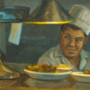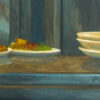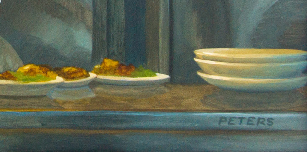 The painting reflects the California social realist movement. Dinah’s Restaurant is known for its homestyle cooking. The establishment opened in 1959 in the Westchester suburb of Los Angeles where it became an LA landmark for its futurist Googie architecture and for its iconic bucket of fried chicken that hovered over its lot. However, Dinah's landlord sold the property to developers, and rather than closing, on May 6, 2024 the restaurant moved to nearby Culver City under the new name, Dinah's Kitchen.