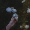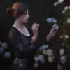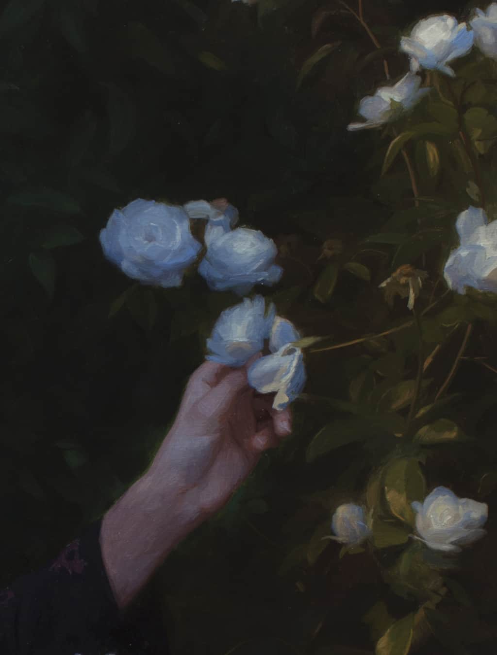 White roses represent simplicity, elegance, hope, purity--and is a favorite choice of flowers among brides for their wedding bouquets. In the painting, Anticipation, Gottlieb sets his subject amidst an abundance of climbing white roses, making the young woman a part of nature's beauty. She cautiously and delicately reaches toward a chosen rose. Will she be rewarded with a romantic sweet perfume or pierced by a sharp thorn? Her Chinese dragon-motif dress adds a degree of auspiciousness to the moment of engagement.