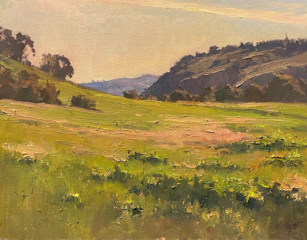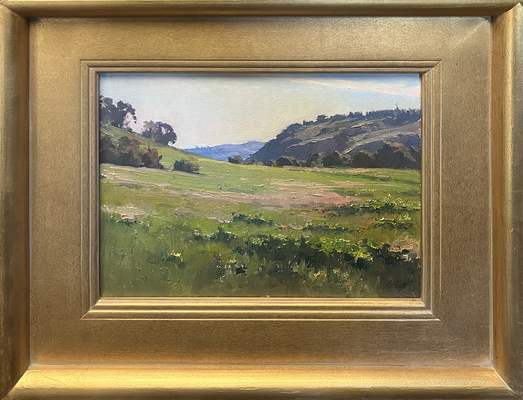 "This beautiful open space in South Orange County has a rich history. The area was named “San Francisco Solano” by the Portola Expedition that camped here in July 1789, while opening the first overland trail through California. During their layover here, one of the soldiers lost his gun, “Trabuco” in Spanish, and the area is now called the Plano Trabuco. Little has changed except for the hiking trails and the many homes lining the surrounding foothills. This painting was painted en plein air on a Spring day while the arroyo was green and the creek was flowing."