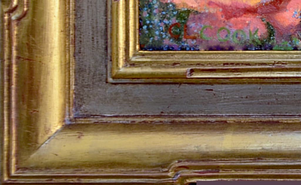 Artist Statement "At Home In The Garden is a visual daydream manifesting a peaceful retreat before the viewer. The vivid colors and contrast convey the comfort of summer in the coastal atmosphere, while specks of color relating to the scene float about the composition presenting a dimension of mystery. The techniques used to create this piece are varied and complex. Besides direct plein air application I also used tools to splash, scratch, scumble paint and even affix pallet scrapings of dry tangled colors in order to create desired textures". —Christopher L. Cook