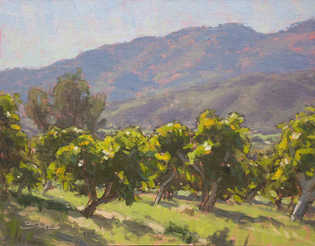 "I painted this piece at the edge of a sloping avocado orchard near my home in Ojai, California. The leaves of avocado trees have a certain amount of shine to them. They reflect the sunlight overhead, leaving little splashes of light here and there across the orchard."