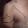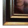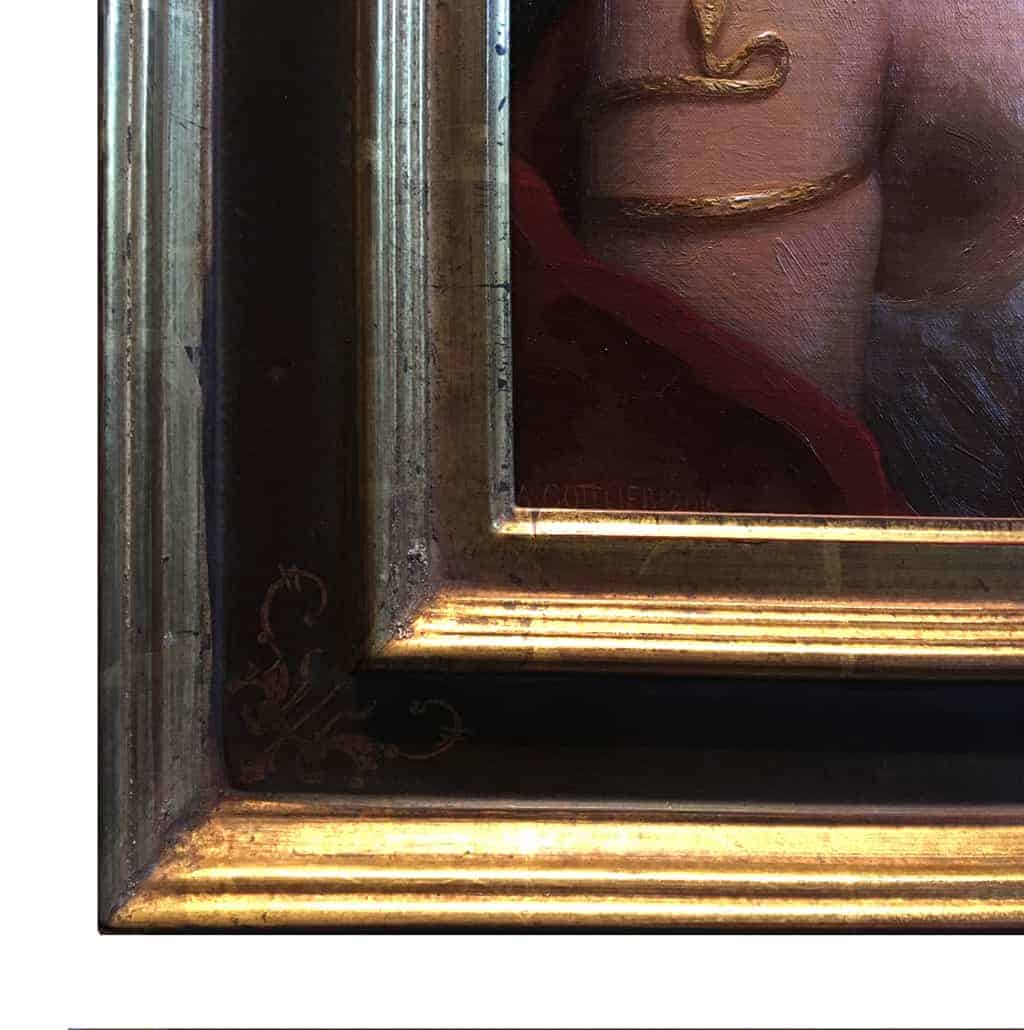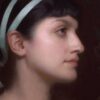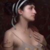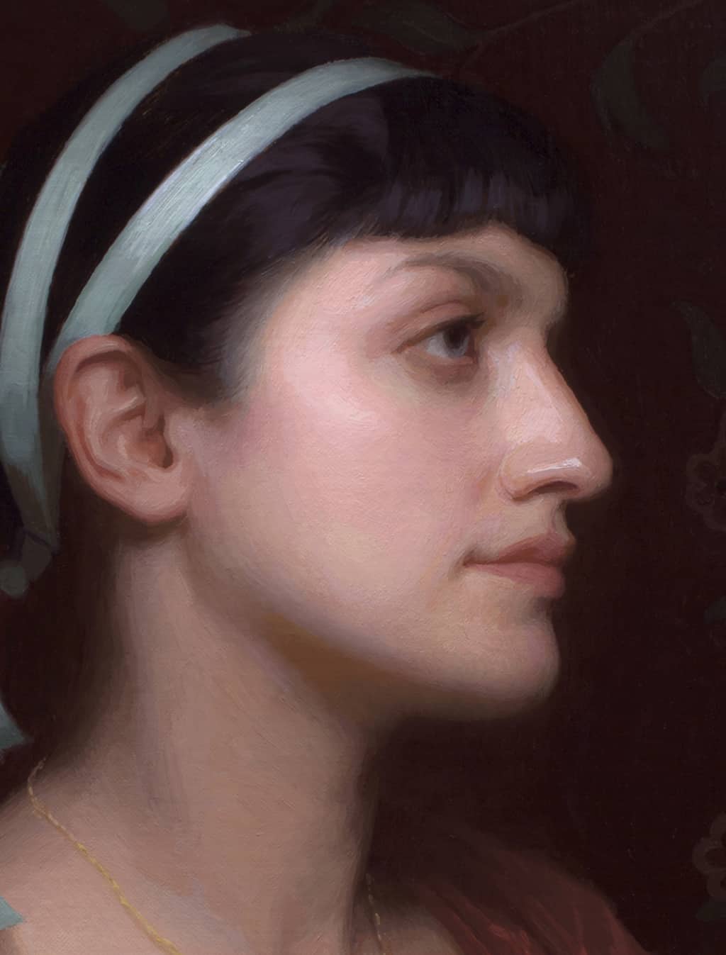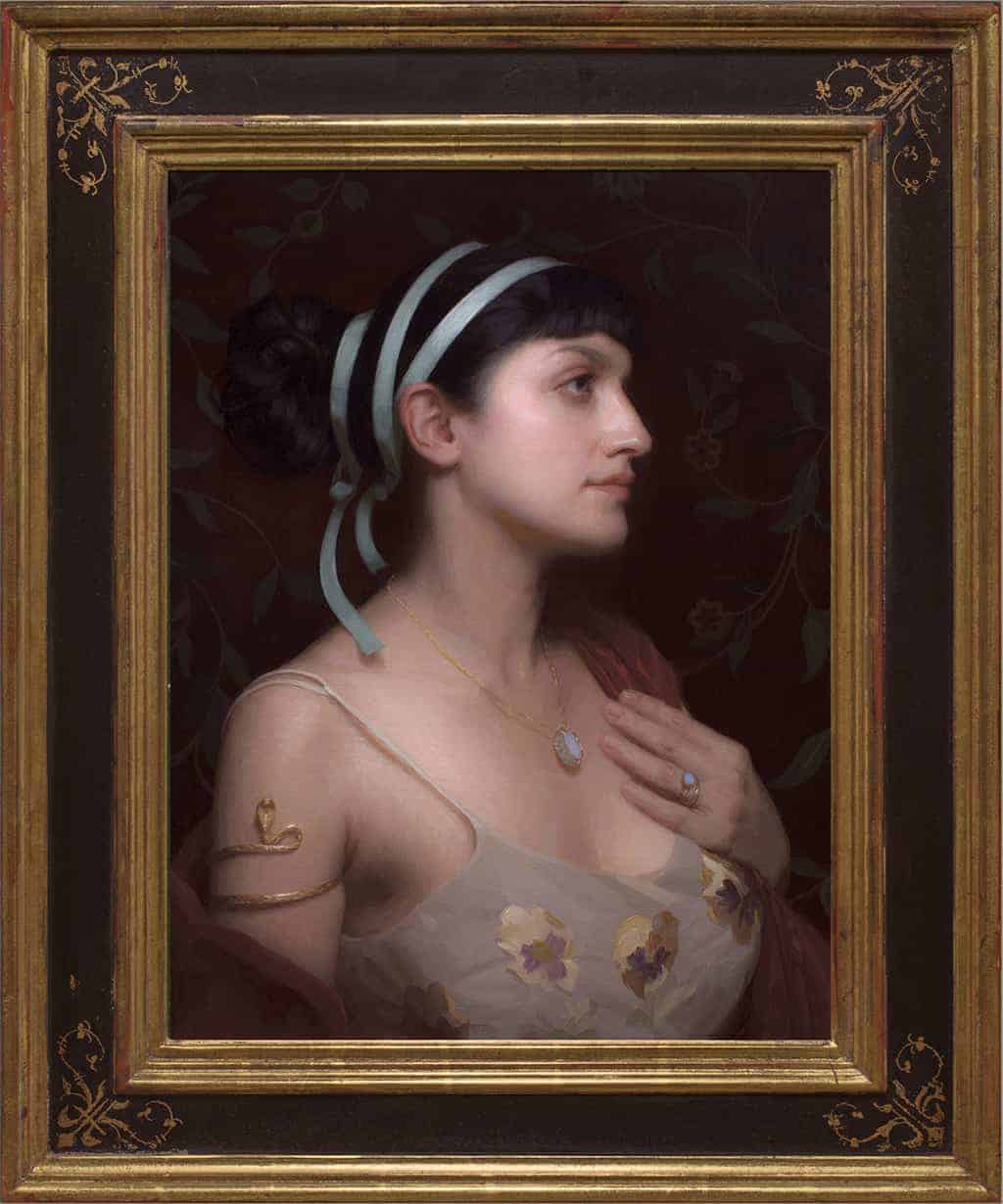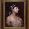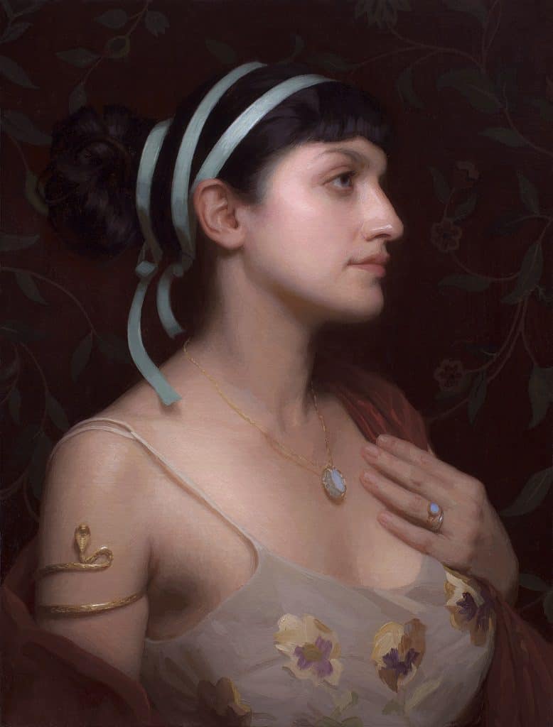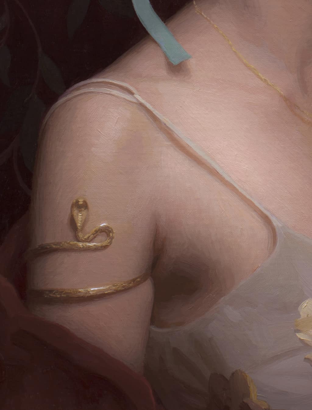 The color, azure, suggests clear blue skies, sailing the Mediterranean, a sense of peace and tranquility. With the azure silk ribbon gently spiraling through her upswept hair, she appears serene, elegant and poised. In this figure painting, Gottlieb emphasizes his subject’s classic feminine beauty by projecting her aquiline profile and long neck against a dark background of floral designs. A golden asp coils around her arm and evokes the memory of Cleopatra, the quintessential symbol of strength, intelligence, and beauty.