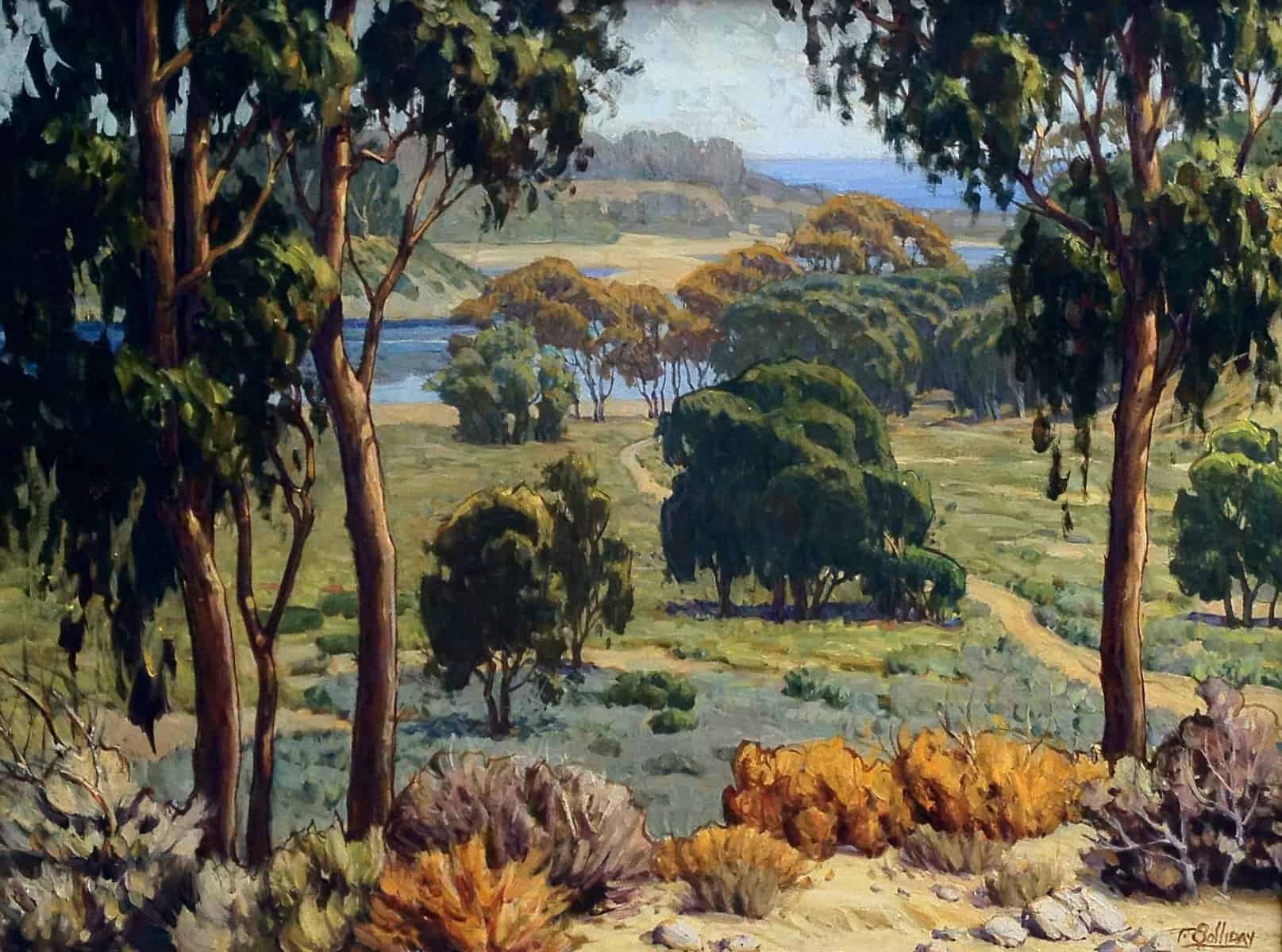 In this painting, Tim Solliday captures a stately panorama view of Batiquitos Lagoon and the Pacific Ocean in the distance. The viewer is instantly drawn into the scene and compelled to hike the trail through the California sagebrush, buckwheat, and stands of eucalyptus. Solliday's bold brushwork and sensitivity to design bring together a rugged, however, poetic experience.