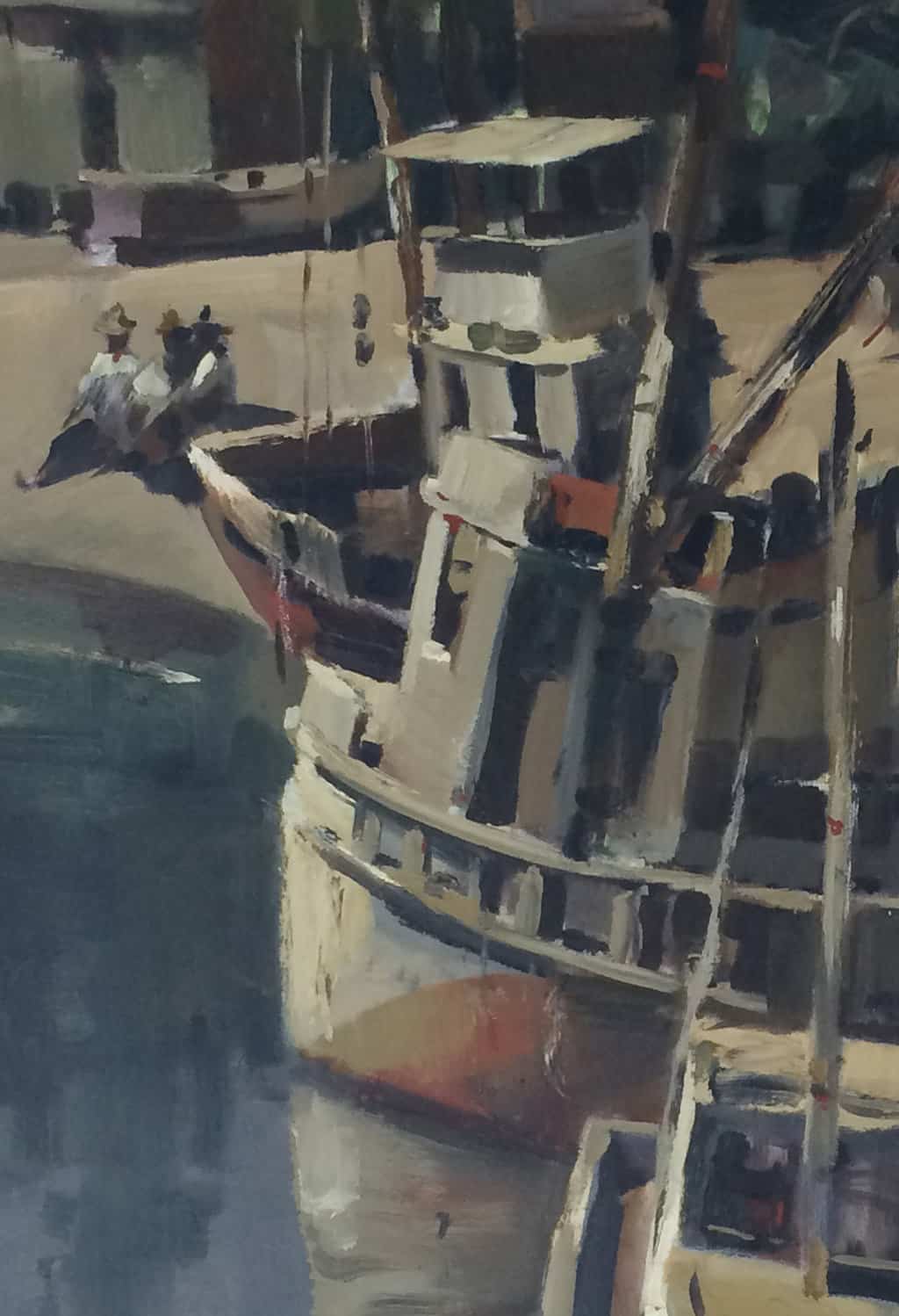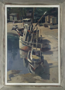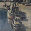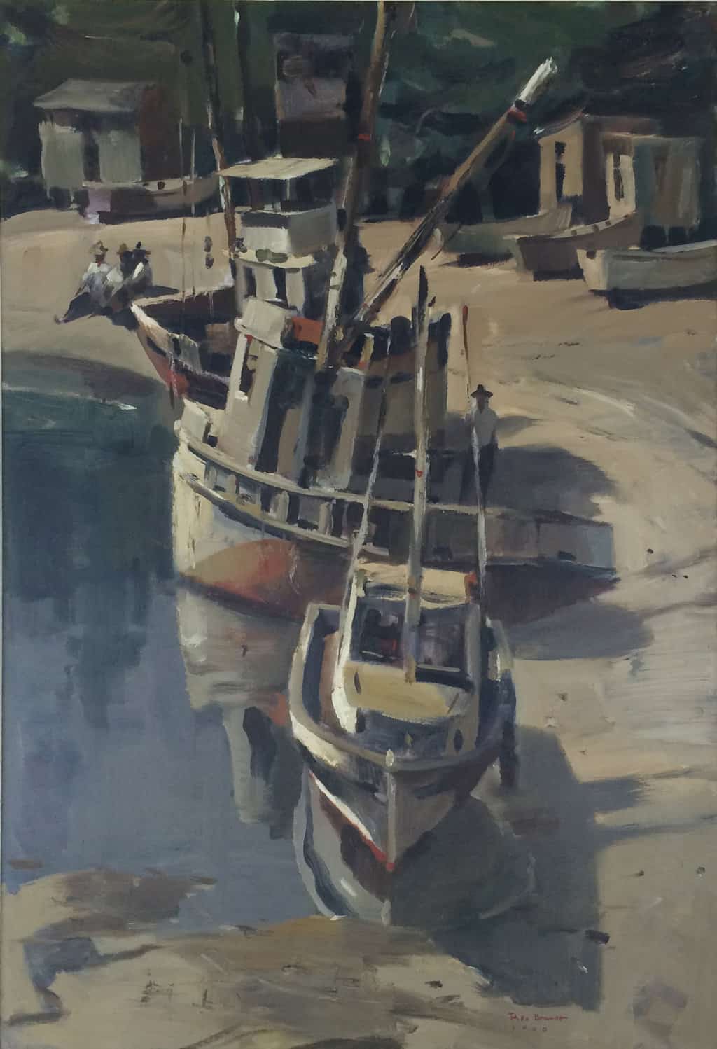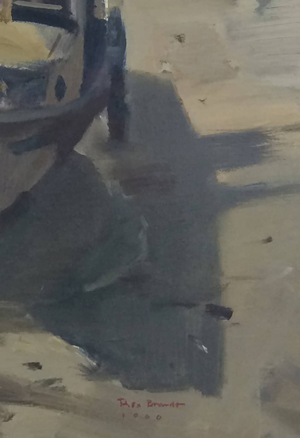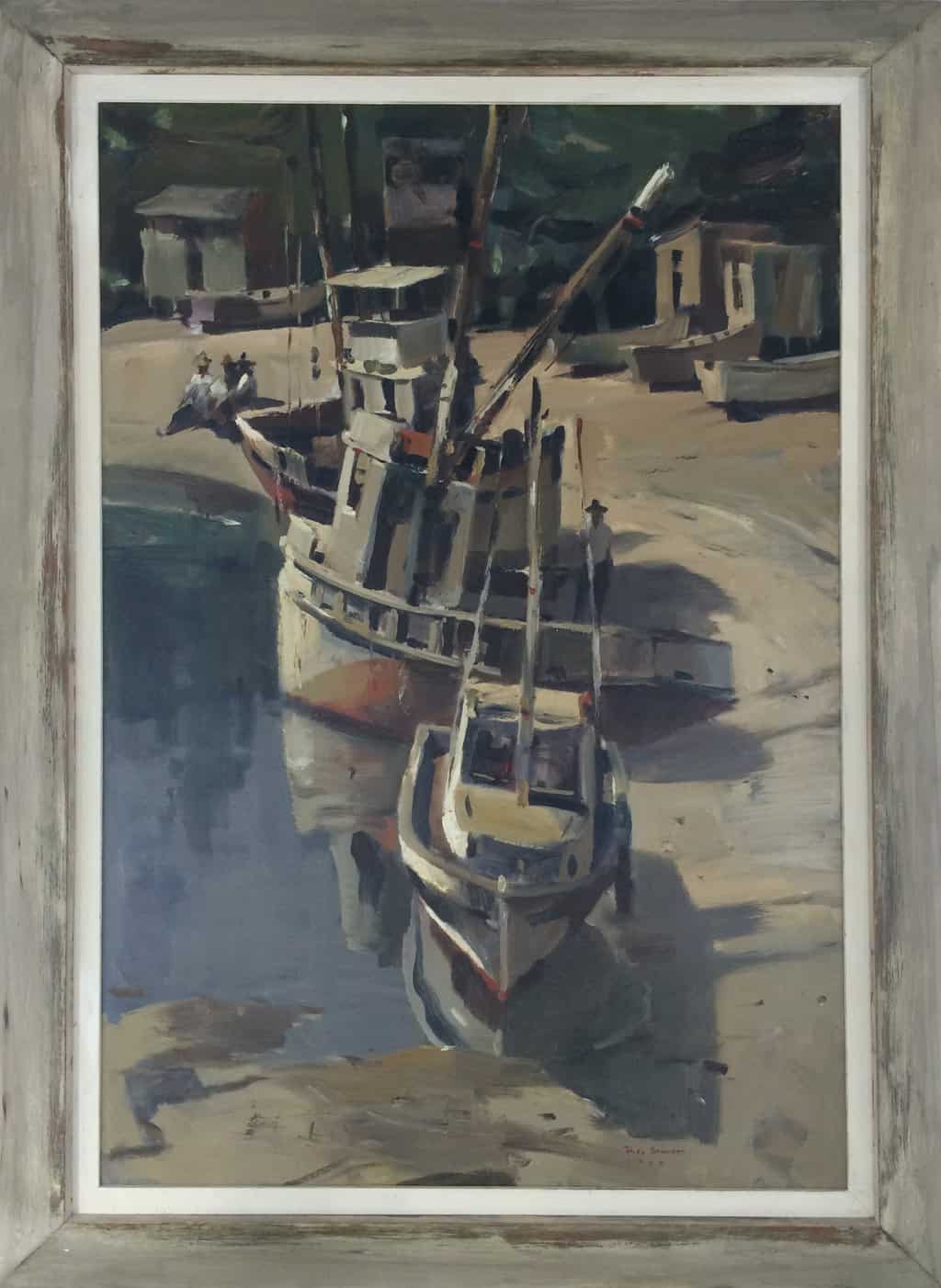 The work is an original oil painting by California Scene Painter, Rex Brandt. The title "Beached Boats" is written on the painting's stretcher-bar. The work is a genuine mid-century painting, dated 1950, and is in excellent, original condition with beautiful color. The scene is believed to be of Newport Harbor and is a classic vintage California subject matter. The painting is in an original period frame, as selected by the artist.