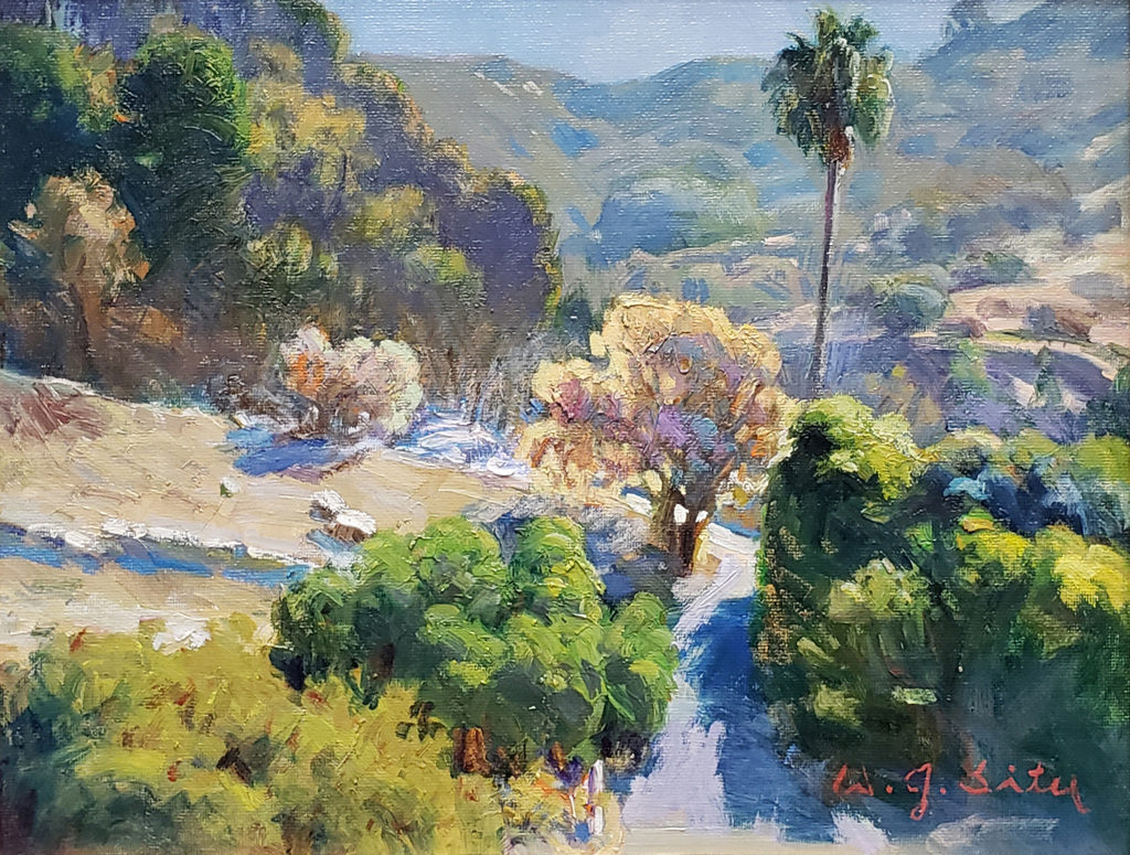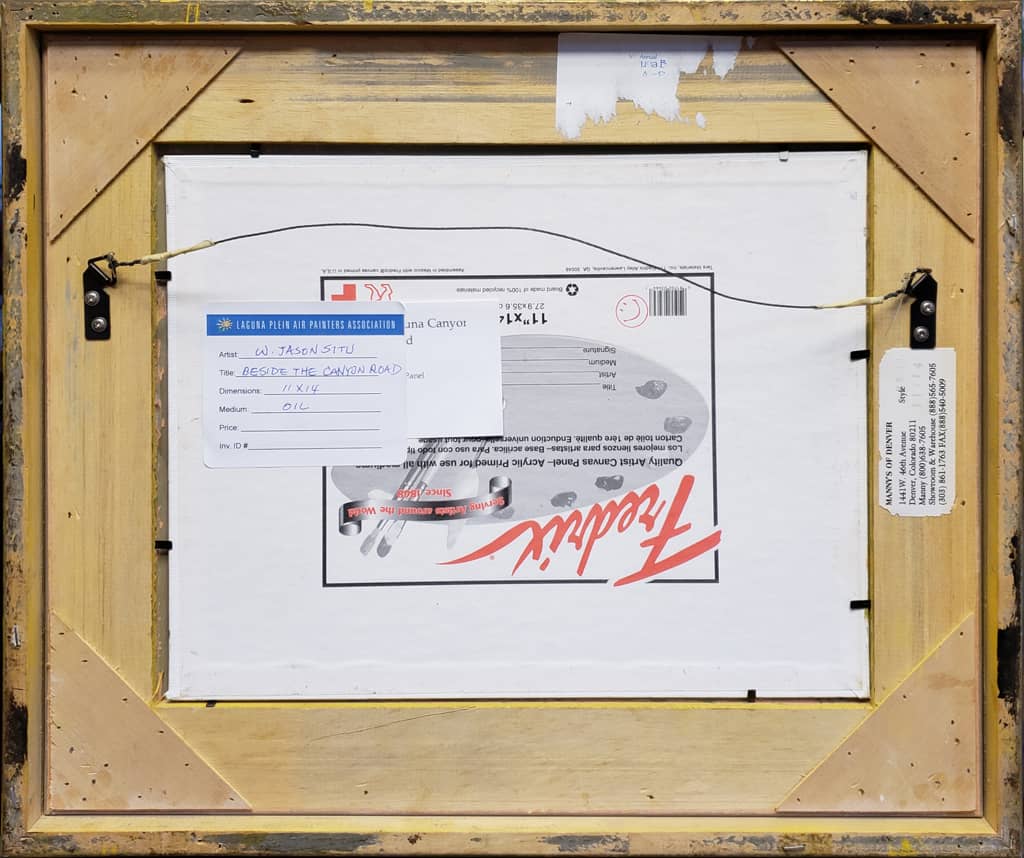 Description Beside the Canyon Road; Laguna Beach was created en plein air by Jason Situ and portrays a favorite location of the artist. Situ expresses, "I like the history of this place. Many artists have been inspired to paint here over the past 100 years." The elevated perspective captures an actual topographic and geologic terrain, while the sunny atmosphere and gentle road entice the viewer into the scene.