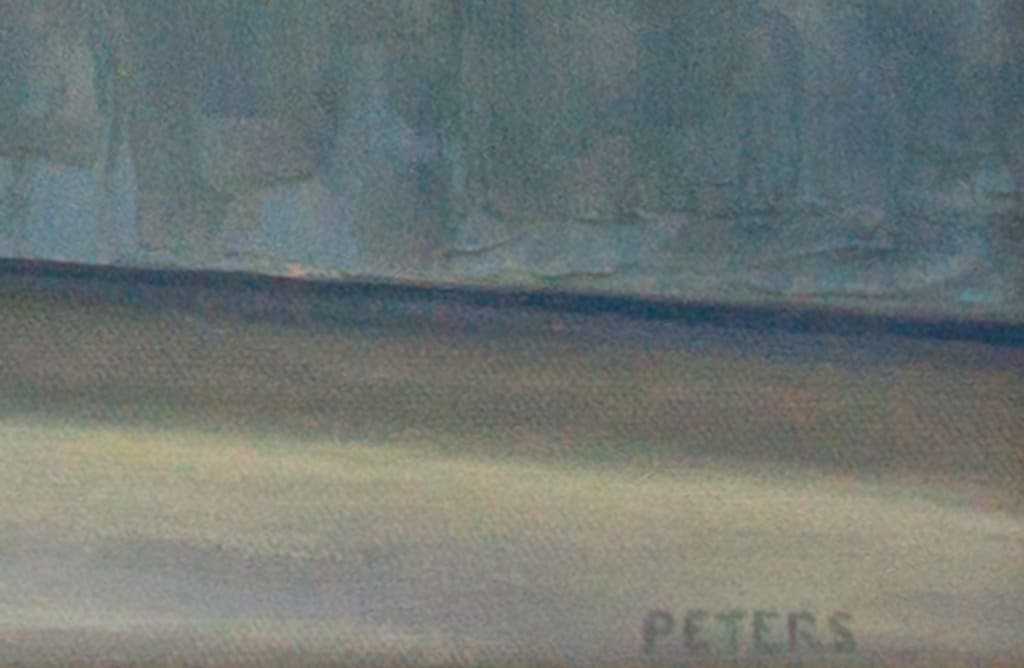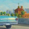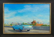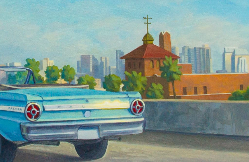 Description Blue Falcon displays a contemporary, urban landscape. The skyscrapers, in the background, could be a metaphor for mountains in the landscape. The clear blue sky matches the hues of the convertible. In this painting, Tony Peters depicts the freeway to symbolize the journey of many travelers. Blue Falcon emphasizes the importance of the journey, rather than the destination.