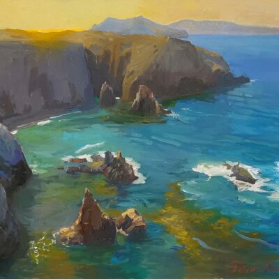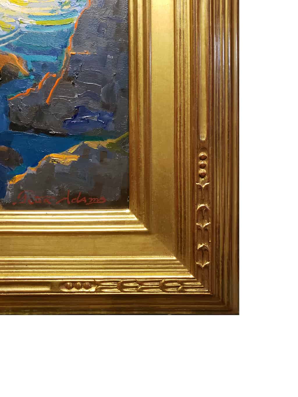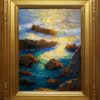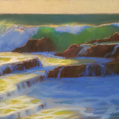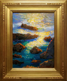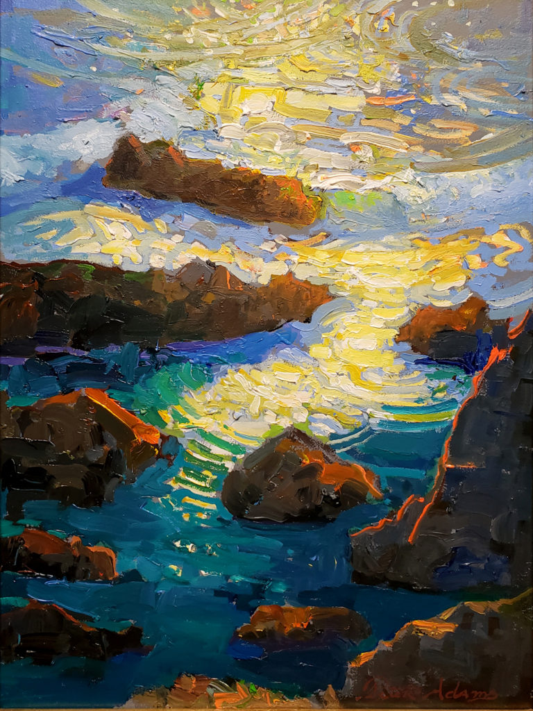 "While on a recent painting trip along the 101 Highway to Carmel I stopped twice to paint at one of my favorite spots, Rocky Point. I particularly love the perspective of looking down at the massive surf crashing on the jagged rocks below. In the late afternoon, I was mesmerized by the blinding reflections of the sun playing on the ocean's surface and creating intriguing patterns of glistening light."
