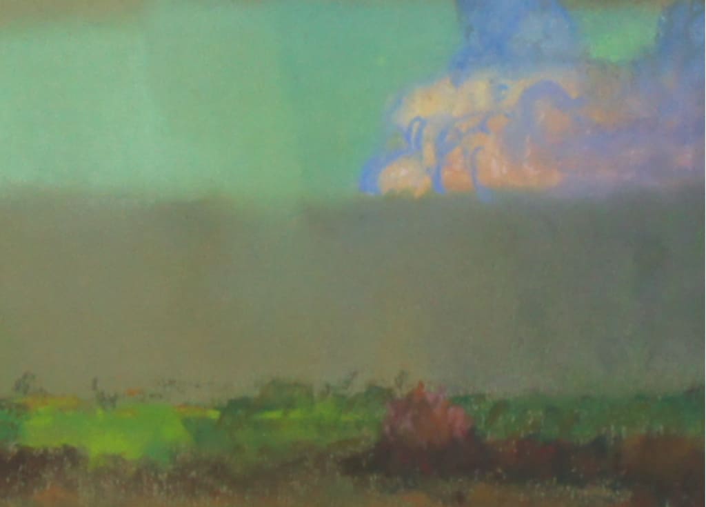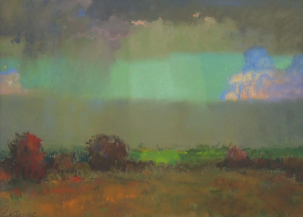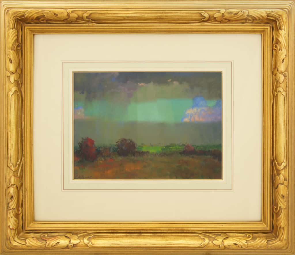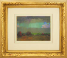 Created en plein air during Lukits’ two-year exploration of the American Southwest (1922–1924), shortly after his move from Chicago to California, the work reflects the freshness and immediacy of direct observation. In California Stormy Sky, Theodore N. Lukits captures the drama and fleeting intensity of a storm breaking over the California landscape. Heavy, layered clouds sweep across the horizon, their deep grays and violets contrasting with pockets of soft light that break through to illuminate the rolling hills below. Using his signature pastel technique—combining luminous color harmonies with confident, painterly strokes—Lukits conveys both the grandeur and the atmospheric nuance of the Golden State’s ever-changing skies. The work is at once bold in composition and subtle in tonal gradations, offering the viewer a sense of immediacy as if the scene might shift in the next moment.
