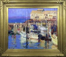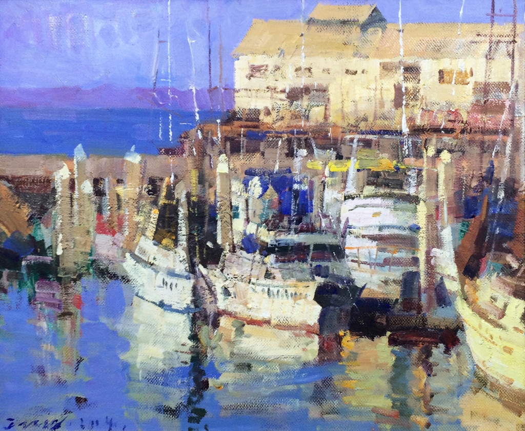 Cannery Row, Monterey" is a strong example of Jove Wang's expressive style that includes his particular palette of rich color and confident painterly approach. Also, the choice of this subject makes the painting additionally important due to the historic significance of California’s history in the commercial fishing industry, which began with early communities of industrious Chinese immigrants.