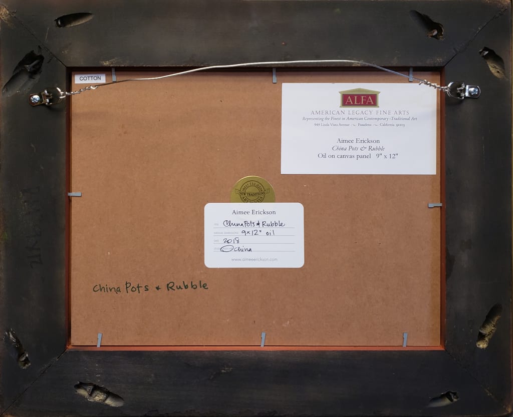 Aimee Erickson Archives Biography Press and Publications View in Room Sizing is approximate. See specs for exact dimensions. Twitter Email Aimee EricksonChina Pots & RubbleOil on canvas panel9" x 12", artwork13.5" x 16.5" x 1.25", framedContemporaryNot AvailableRequest More Information Provenance Acquired by American Legacy Fine Arts directly from the artist Exhibited China's Crown Jewel; Recent Paintings by American Artists, American Legacy Fine Arts, June 21 – July 28, 2019 Need help? Call our ALFA specialists +1 626.577.7733