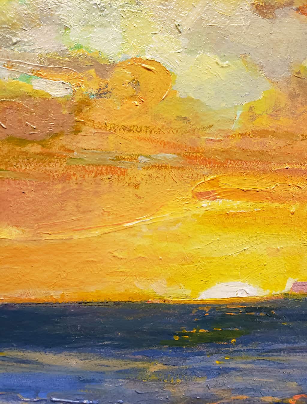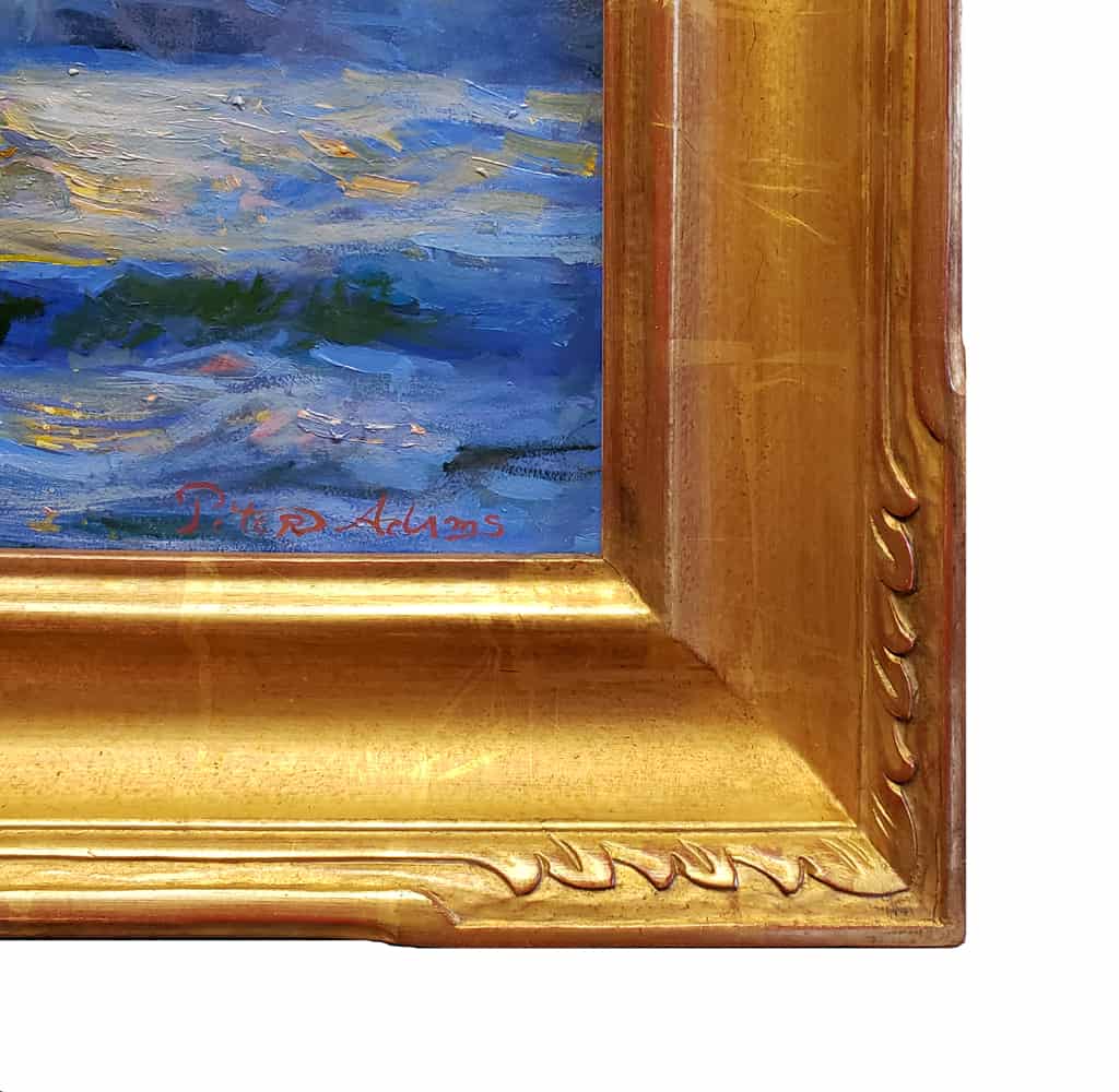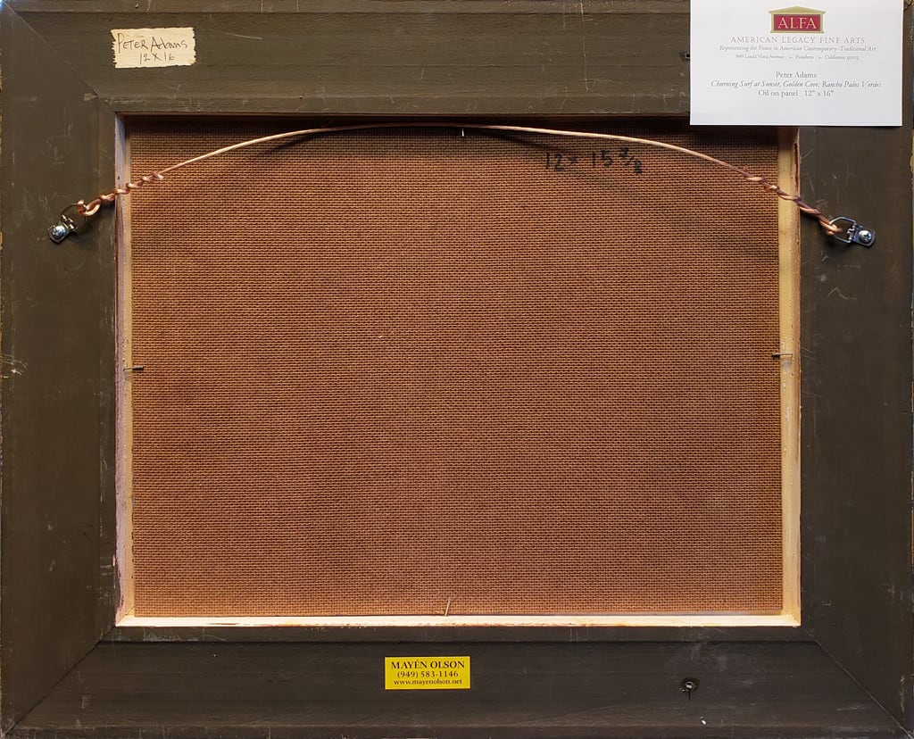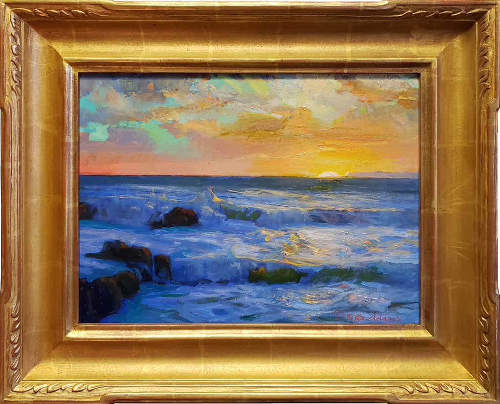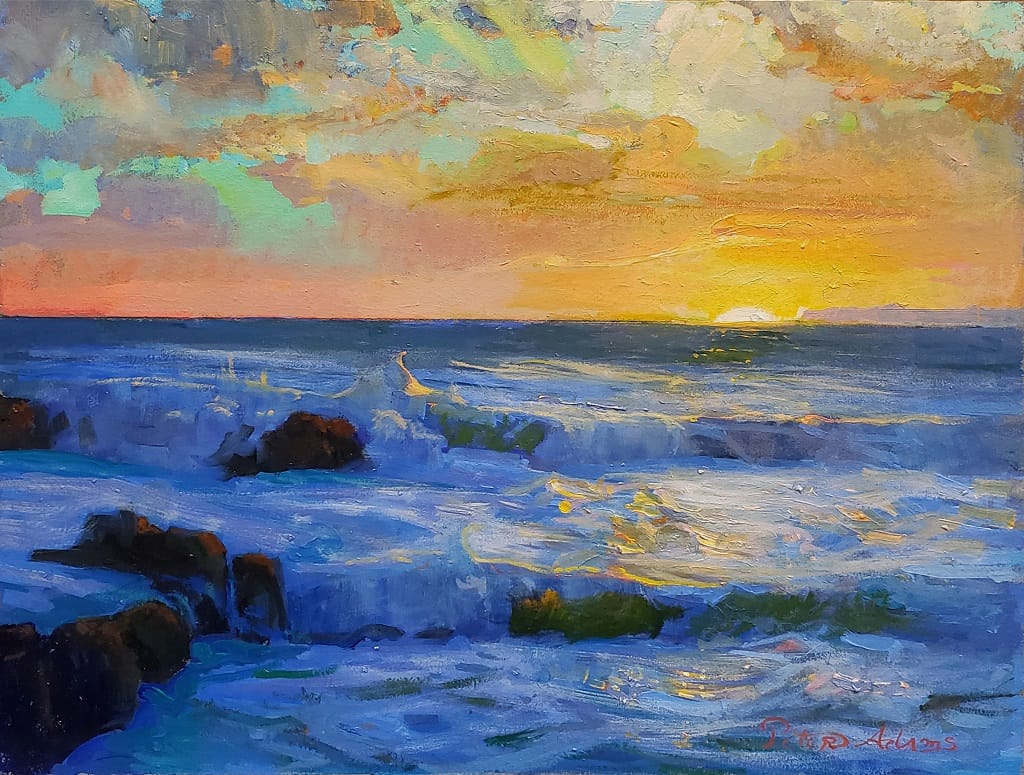 “Painting the foam patterns of churning waves is an aesthetic pleasure for me and an intriguing adventure. To paint the scene at sunset adds another dimension to the challenge.”
