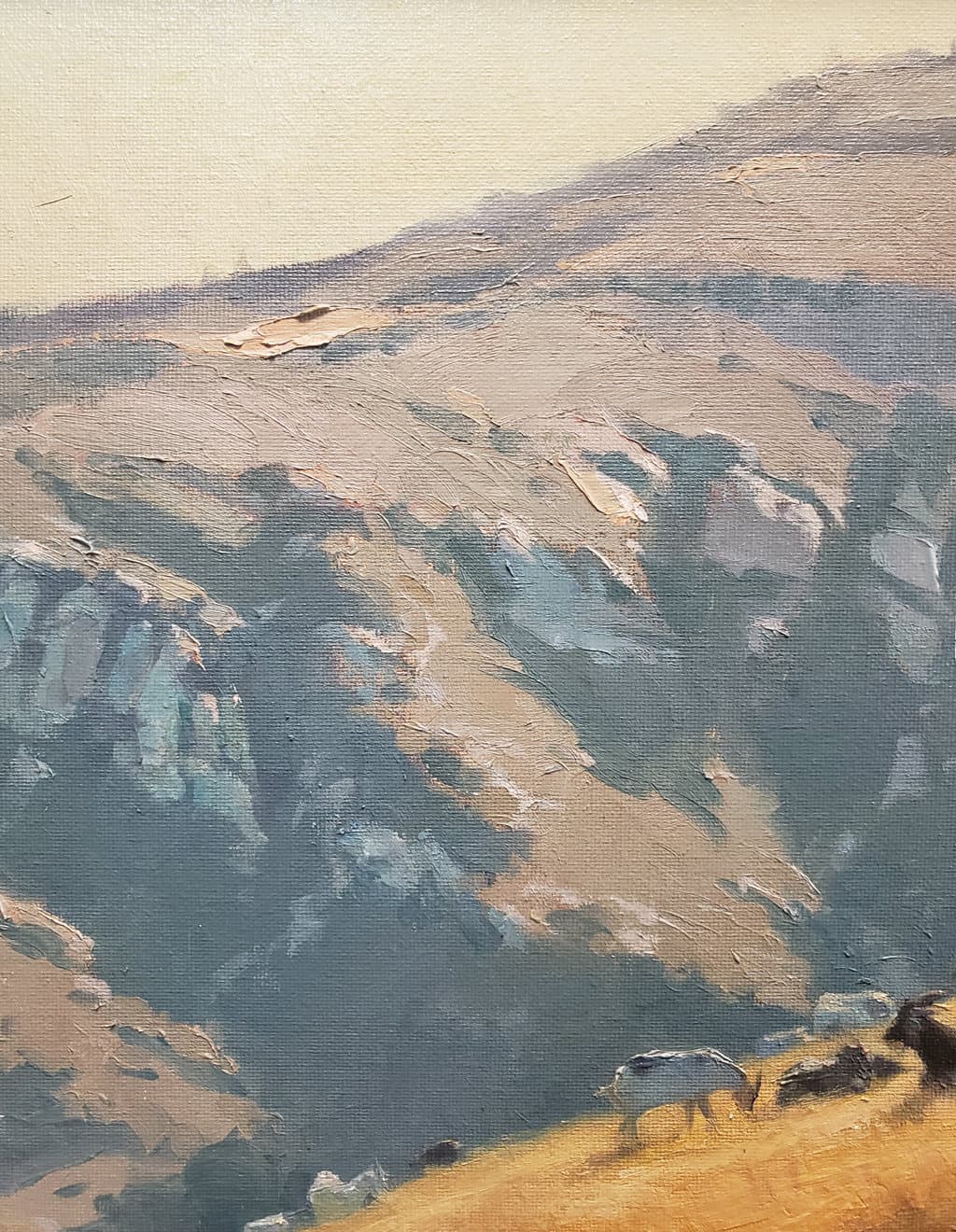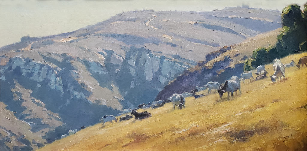 "Each year, Laguna Beach utilizes goats for brush control, reducing fire danger in the hills above the city. As I set out to paint this scene, I was delighted to find them. They always add to a painting, especially high above the canyons."