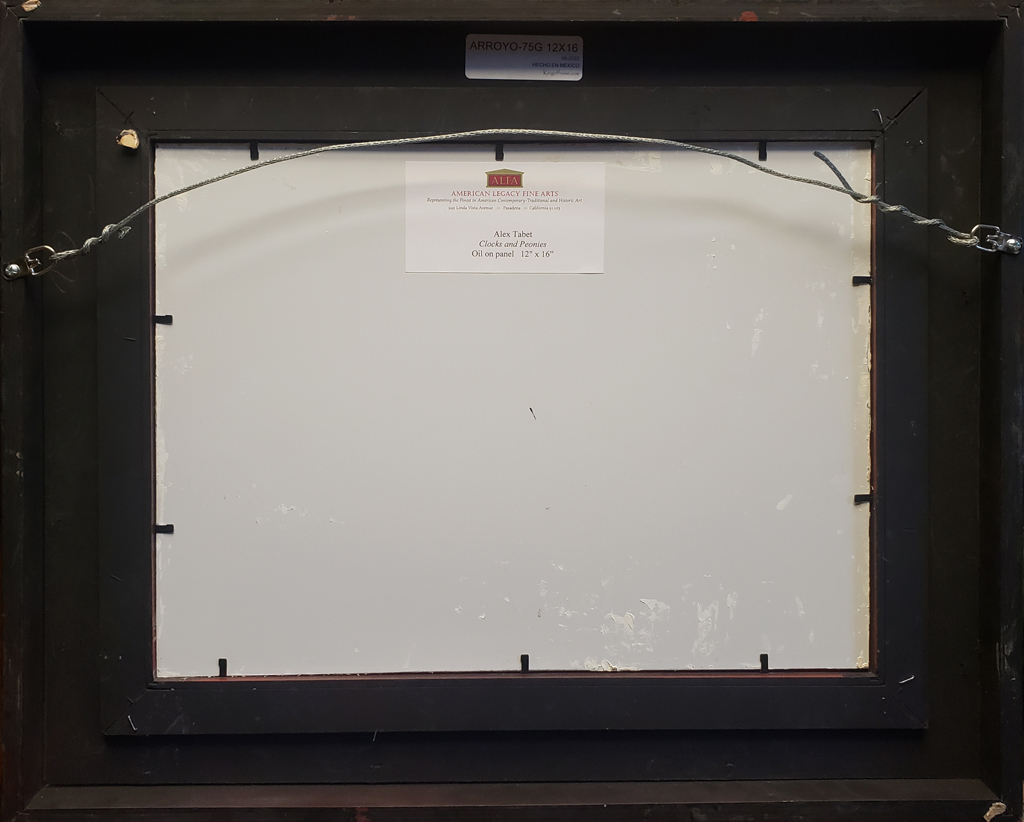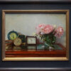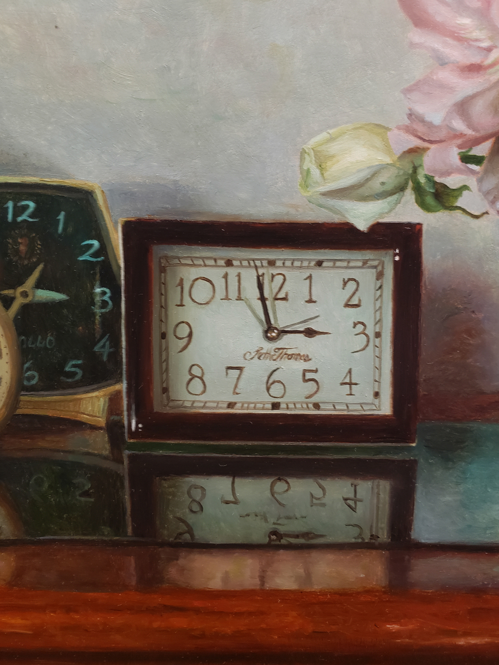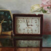 “’Clocks and Peonies’ explores the intricate balance between the passage of time and the ephemeral beauty of nature. At the heart of the composition rests a delicate vase, cradling a lavish bouquet of peonies in full bloom. Their petals unfurl in a graceful display of pinks and creams. Beside the peonies, an array of antique clocks stands like sentinels from another era. The juxtaposition of delicate grace and mechanical intricacy creates a visual dialogue between the fleeting and enduring. The blossoms’ fragility contrasts the timeless mechanisms of the clocks, encouraging the viewer to savor each moment while acknowledging the ceaseless march of time.”