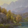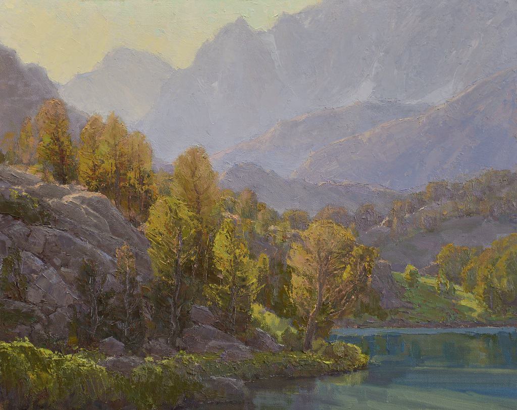 "Painted from a study done on-location while camped in the Big Pine Canyon area of the John Muir Wilderness, Sierra Nevada Range. Artist friends and I mule-packed in and set up camp for a week of hiking and painting. This is a scene close to our camp at Sixth Lake, where, in the late afternoon everything gets a beautiful back-lit glow from the low sun. I chose to enjoy it, not with a cocktail, but by painting, and I think I made the right decision!”