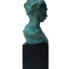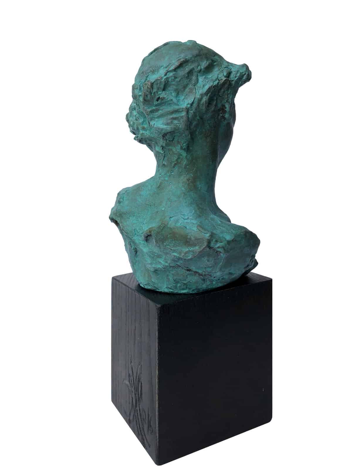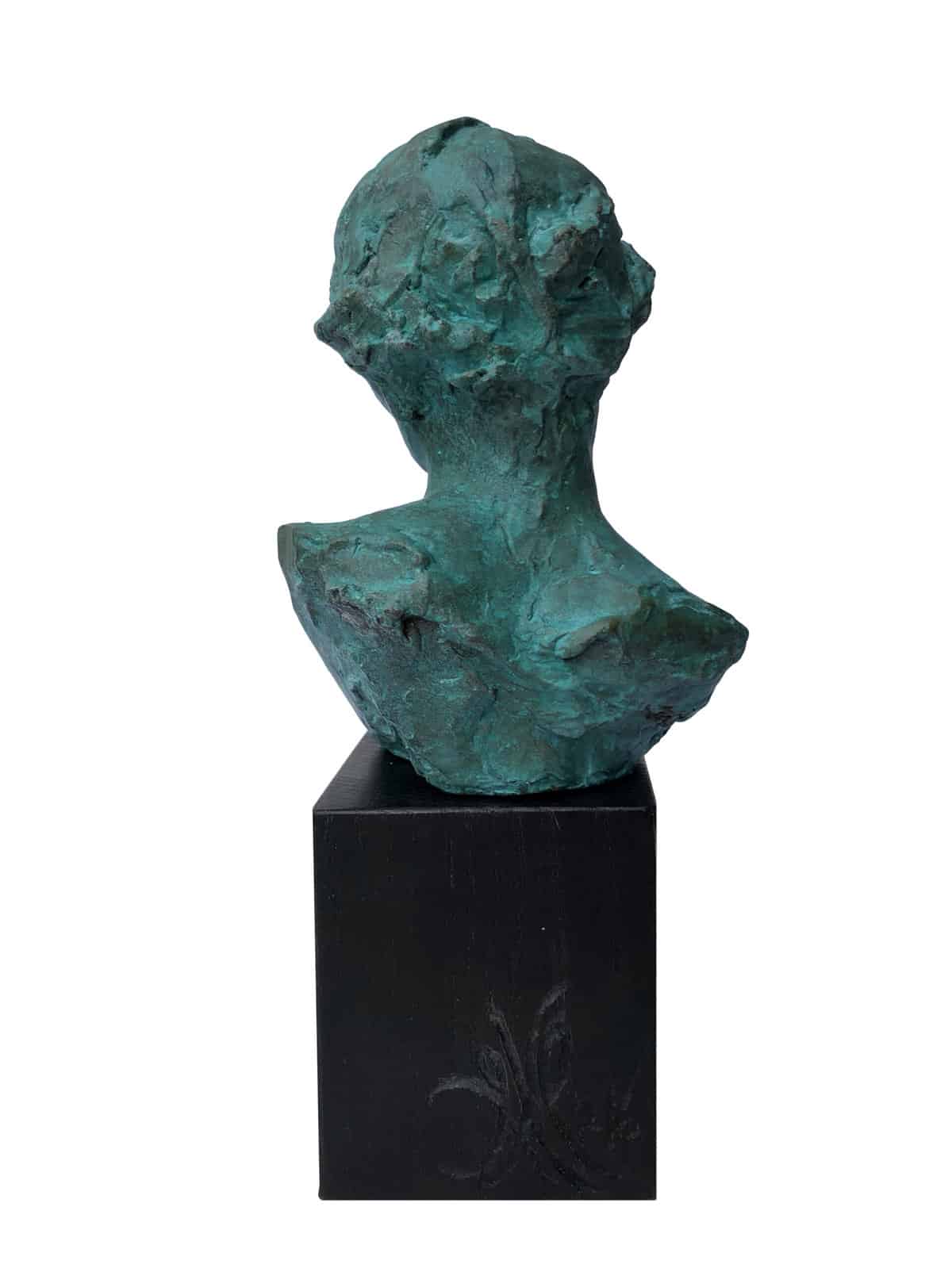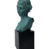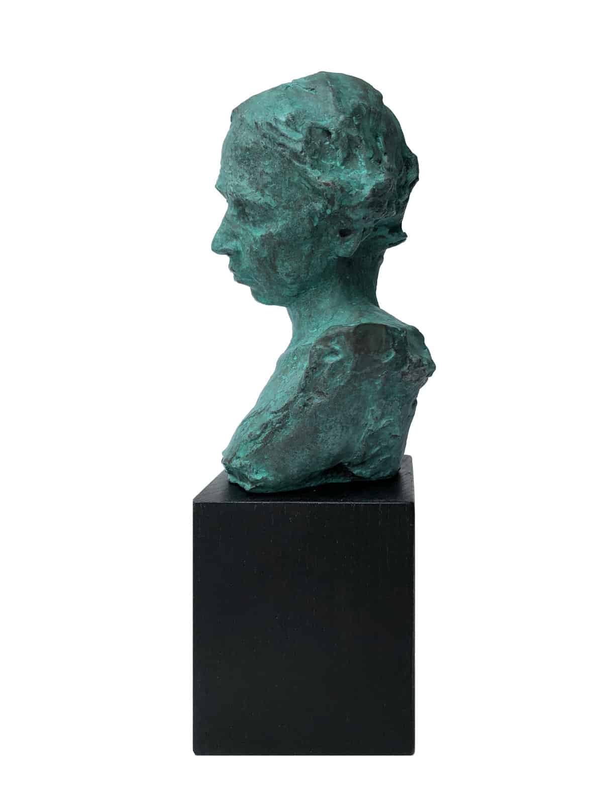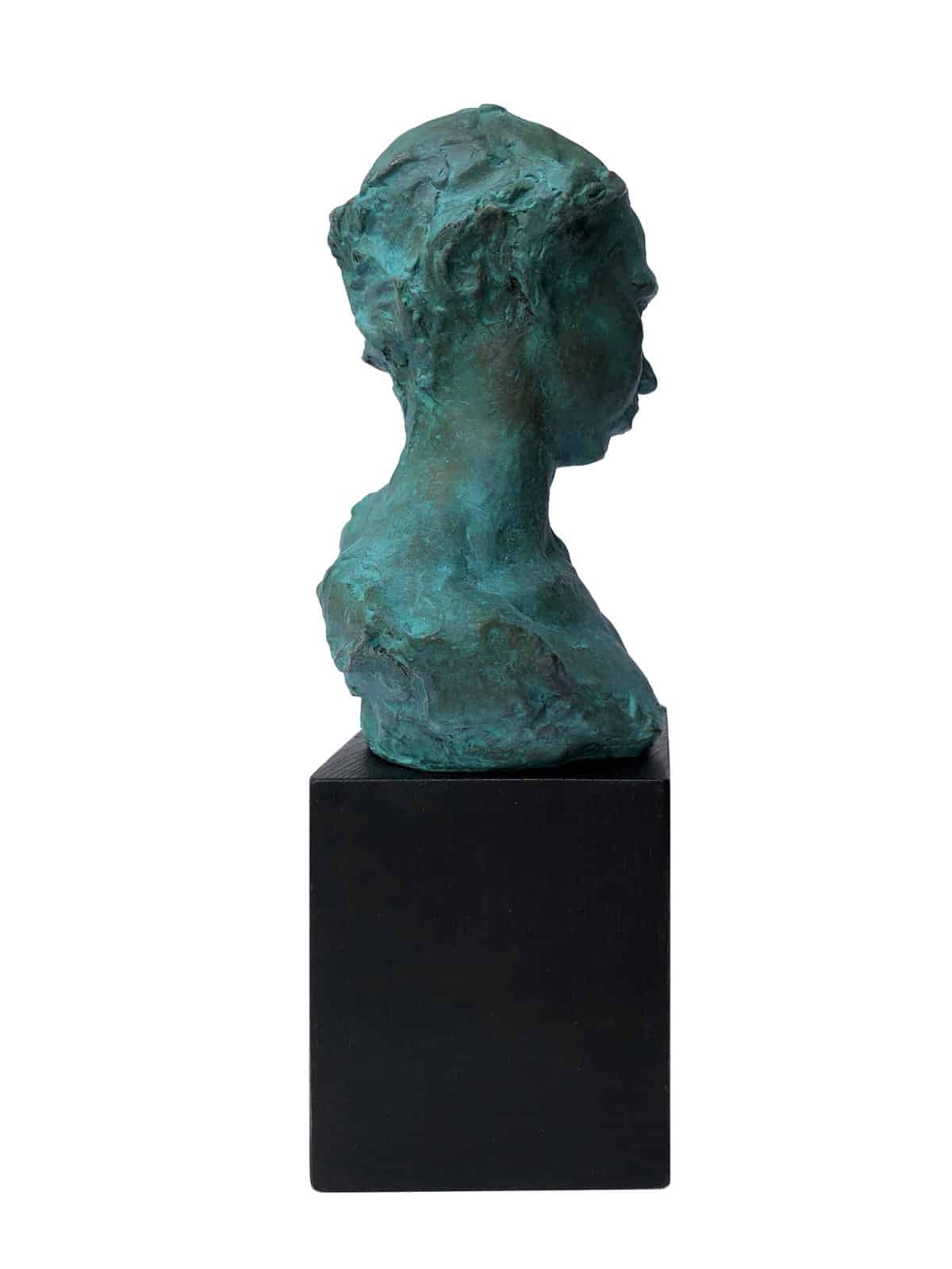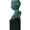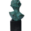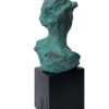 “This seven-inch portrait bust is the subject of an ongoing project to experiment with surface treatments and presentation. The first casting was an artists' proof which is a wall hanging plaster on a wooden backdrop, stained with tea and ink (a treatment I use often with plaster pieces). Two bronze castings (editions of 1 /6 and 2/6) exist with a green patina. The following editions will vary in color. The piece was modeled from imagination and is intended to be ambiguous in identity, gender, age, and expression in order to explore how different treatments will affect the emotional content and perception of the piece.”