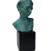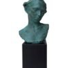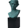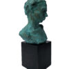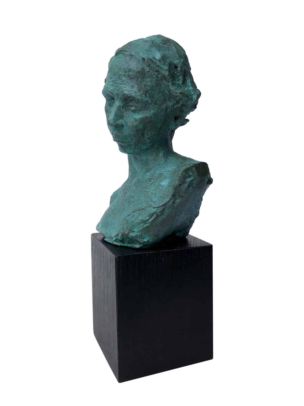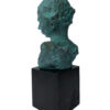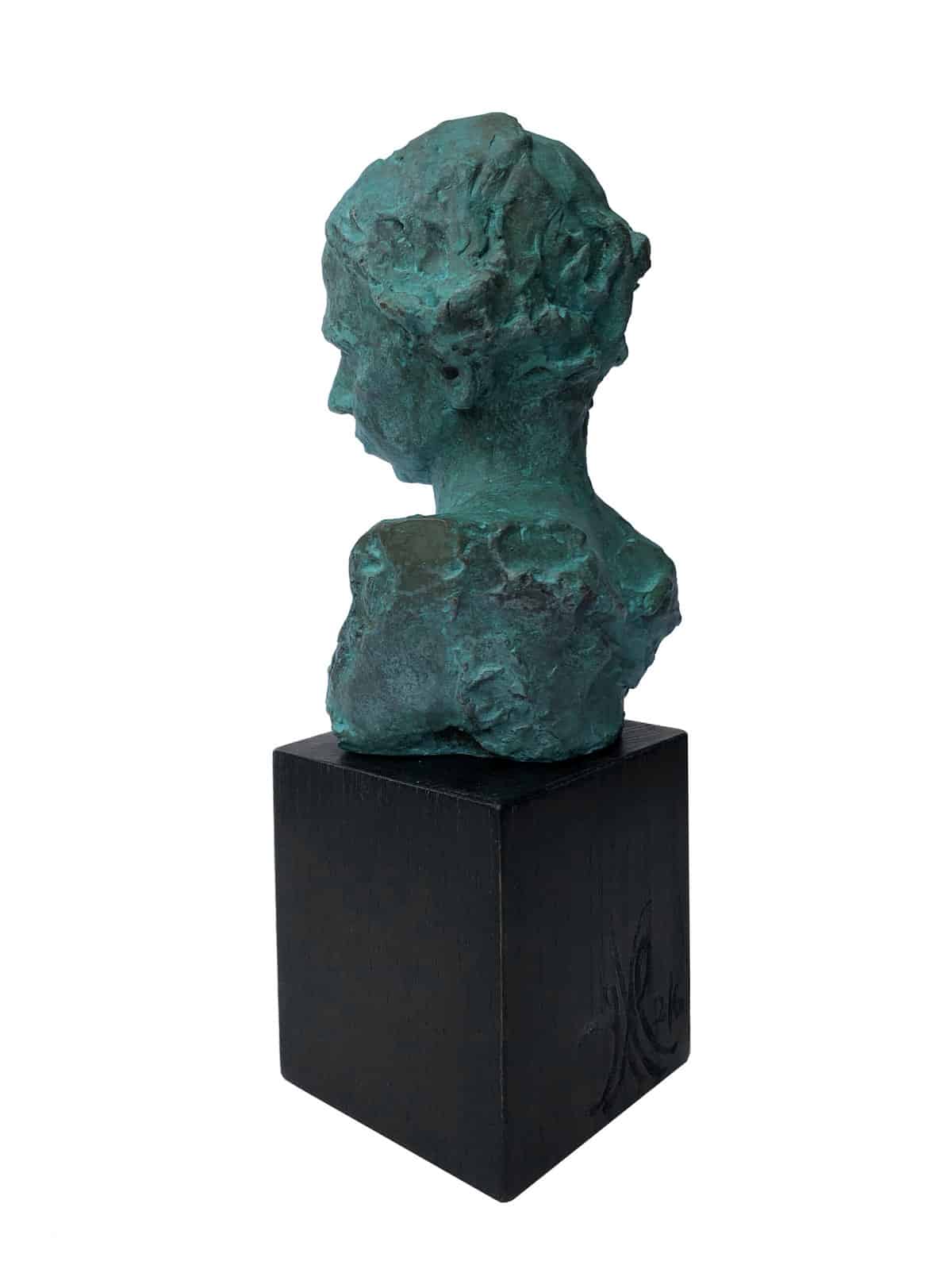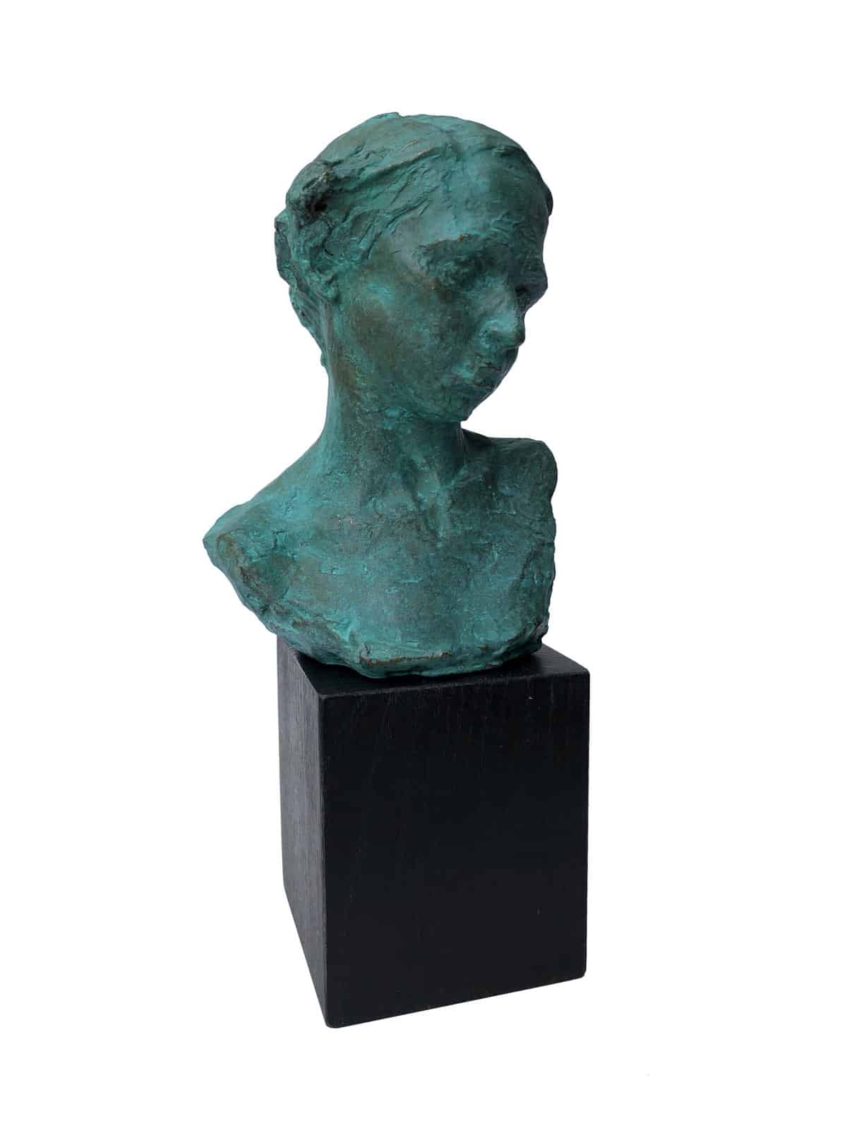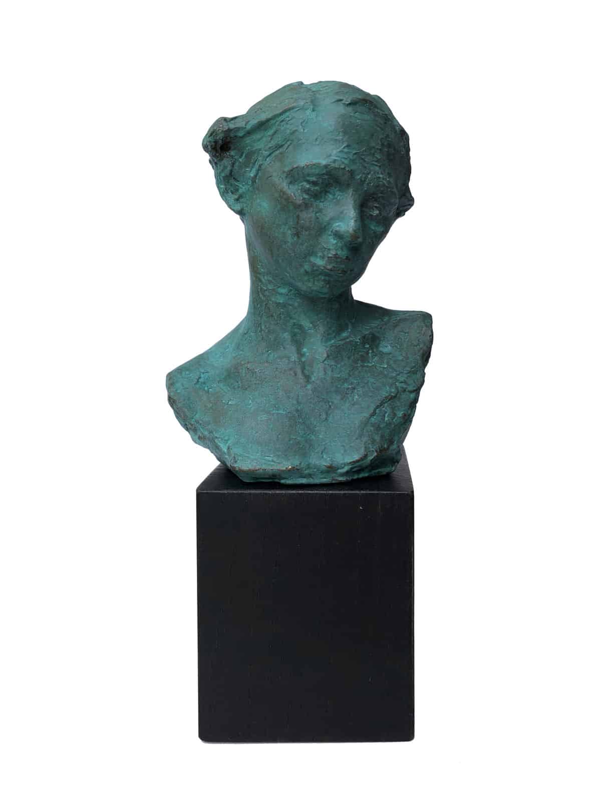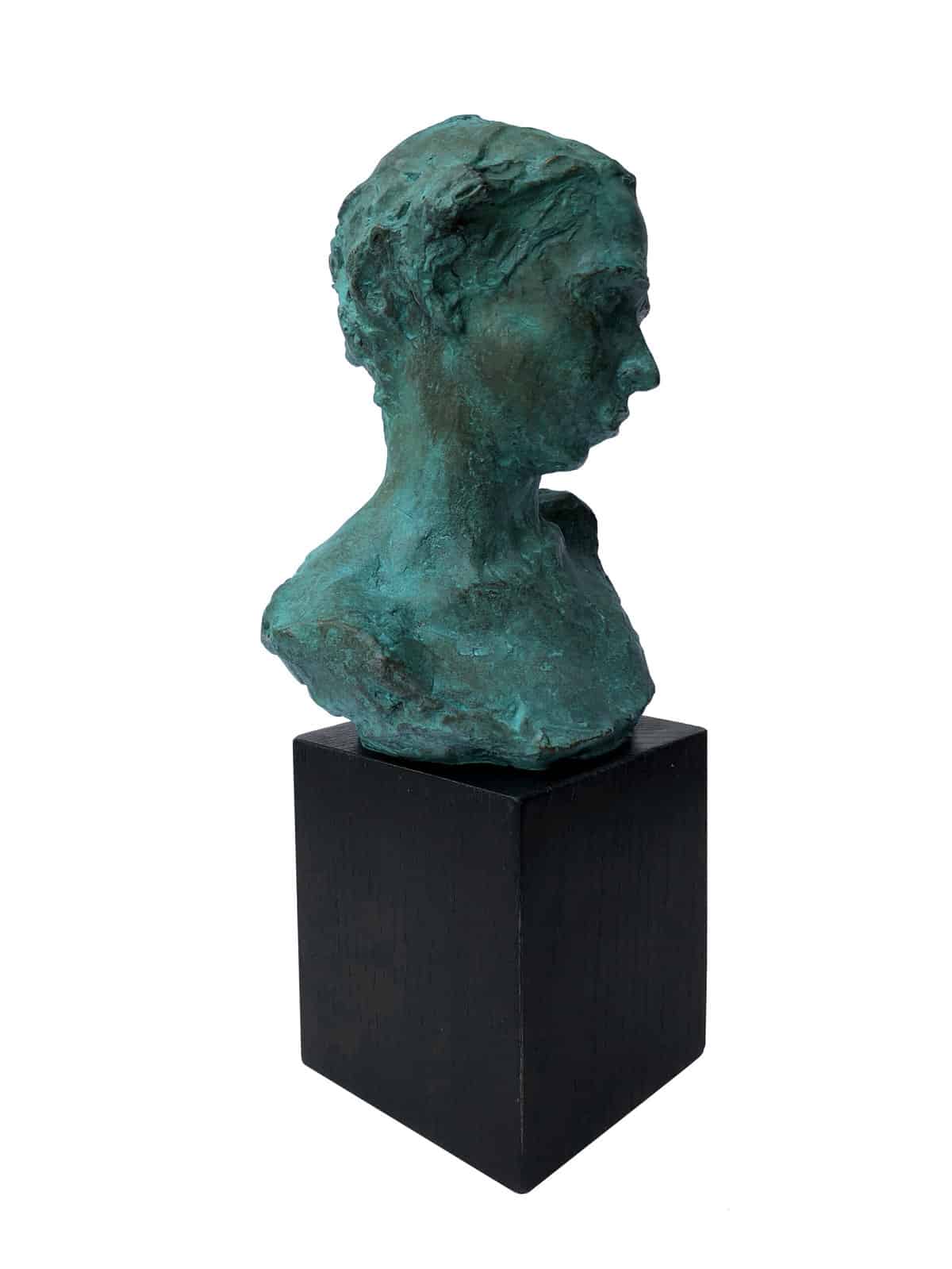 “This seven-inch portrait bust is the subject of an ongoing project to experiment with surface treatments and presentation. The first casting was an artists' proof which is a wall hanging plaster on a wooden backdrop, stained with tea and ink (a treatment I use often with plaster pieces). Two bronze castings (editions of 1 /6 and 2/6) exist with a green patina. The following editions will vary in color. The piece was modeled from imagination and is intended to be ambiguous in identity, gender, age, and expression in order to explore how different treatments will affect the emotional content and perception of the piece.”