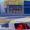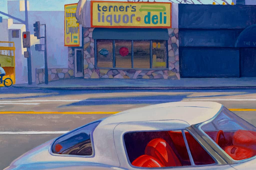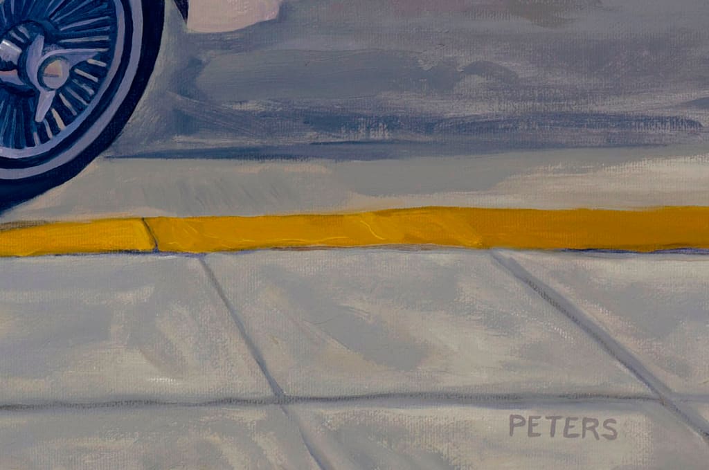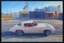 Tony Peters’ Corvette on Sunset takes the viewer back to a different time in Los Angeles. A surprisingly desolate Sunset Boulevard is the central focus of the painting. The only human subject, in the background, rides his bicycle in the opposing direction. Meanwhile, the vintage Corvette points onward, possibly alluding to the future.