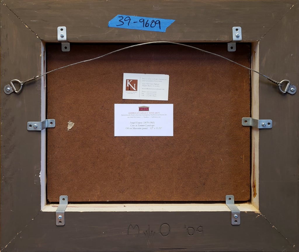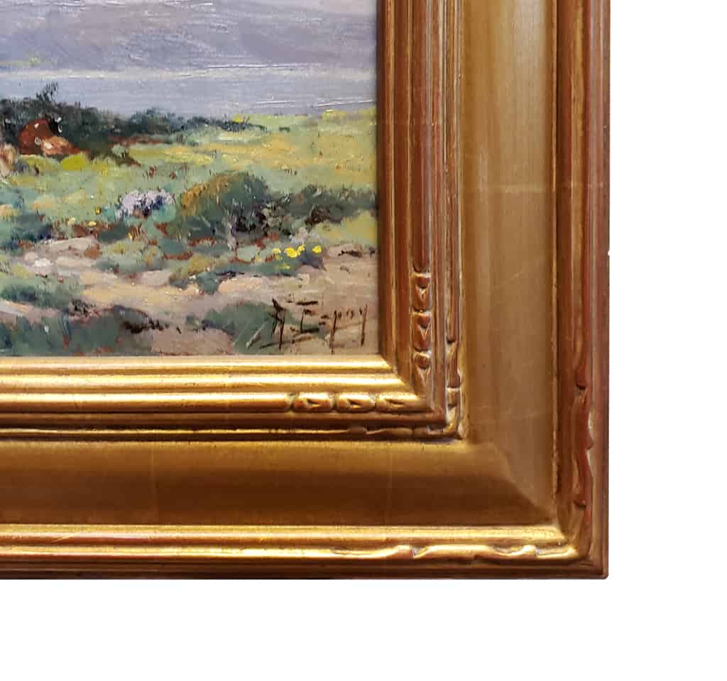 Custom handcrafted by Mayén & Olson in 2009, the frame is finished in 22K gold leaf and designed in a classic plein air style. Its softly burnished surface and stepped profile enhance the painting’s warm, sunlit palette while providing a historically appropriate presentation for a work of California Impressionism.