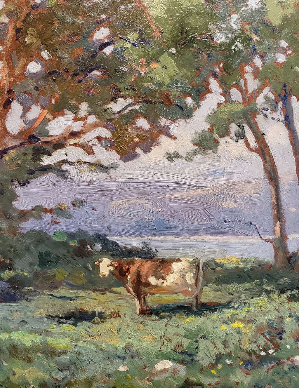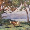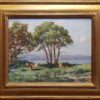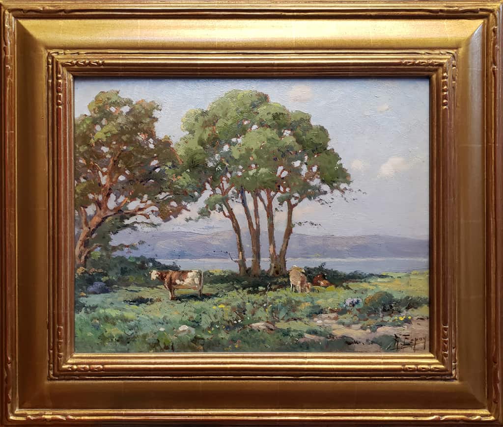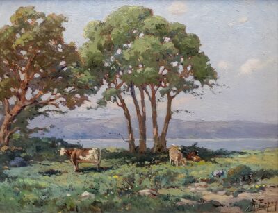 In this idyllic composition, Angel De Service Espoy captures the timeless rhythms of California ranch life along the Central Coast. Likely set in Carmel Valley or the rolling hills of Monterey County, the painting depicts a small herd of cattle grazing peacefully beneath the dappled shade of eucalyptus trees, with the Pacific Ocean glimmering softly in the distance. Espoy’s confident brushwork and sun-washed palette evoke the gentle warmth of a summer afternoon, while his thoughtful arrangement of animals, foliage, and rolling hills conveys a deep appreciation for the natural harmony of rural California. The sprinkling of wildflowers in the foreground and the luminous coastal haze lend a sense of immediacy and atmospheric depth, suggesting a plein air vantage point familiar to artists painting above Carmel or Pacific Grove during the early 20th century. Espoy’s style blends Realism and Impressionism, drawing upon the influences of his training under Joaquín Sorolla (1863–1923) and the French Barbizon School, resulting in works that balance truthful representation with a painterly, light-filled immediacy.