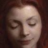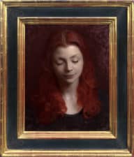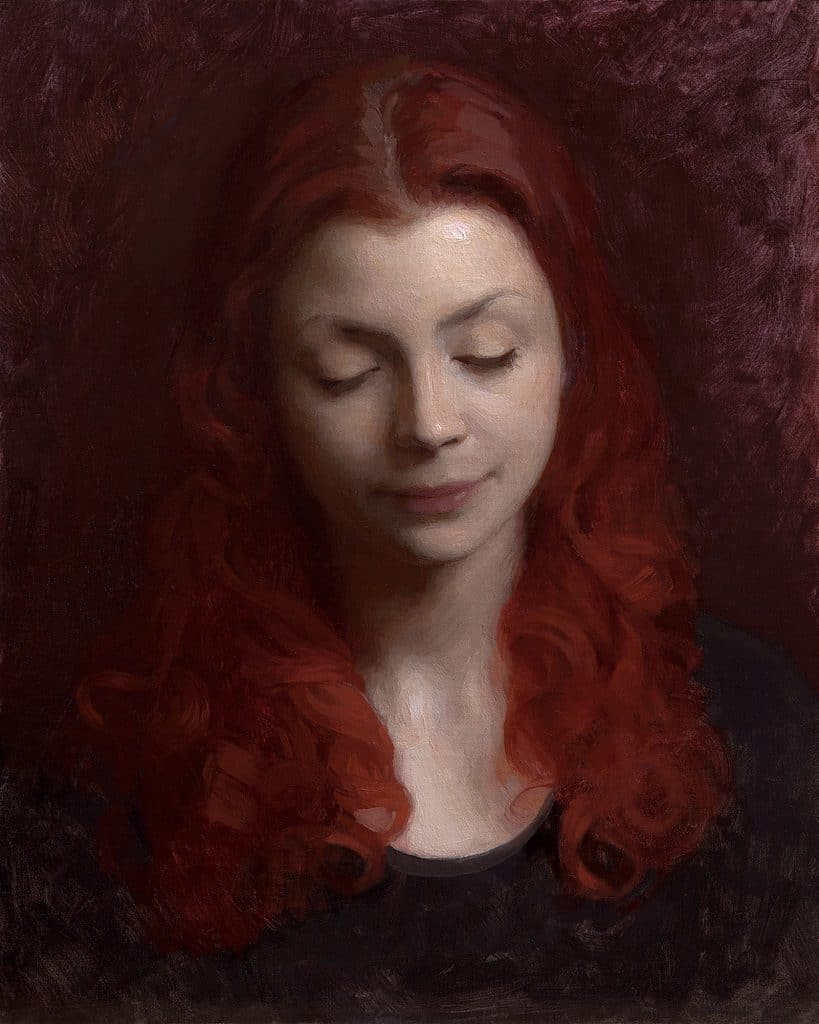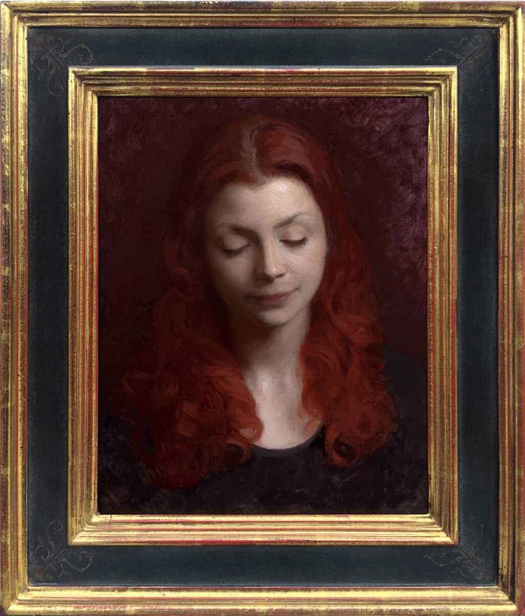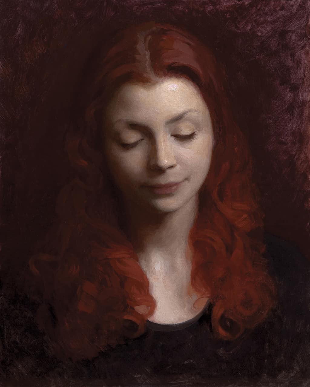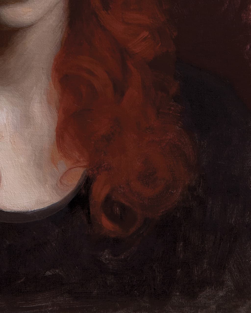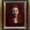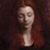 In Adrian Gottlieb's oil painting, Crimson, the artist contrasts the intensity of his model's fiery locks by capturing her in a moment of thoughtful conversation. Her expression is demure as she looks gently downward, perhaps in search of a gracious reply. The subject is reminiscent of the Pre-Raphaelite artist Dante Gabriel Rossetti's muse, the red-haired Elizabeth Siddal.