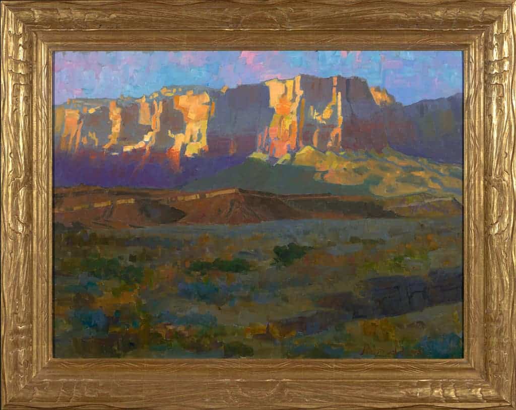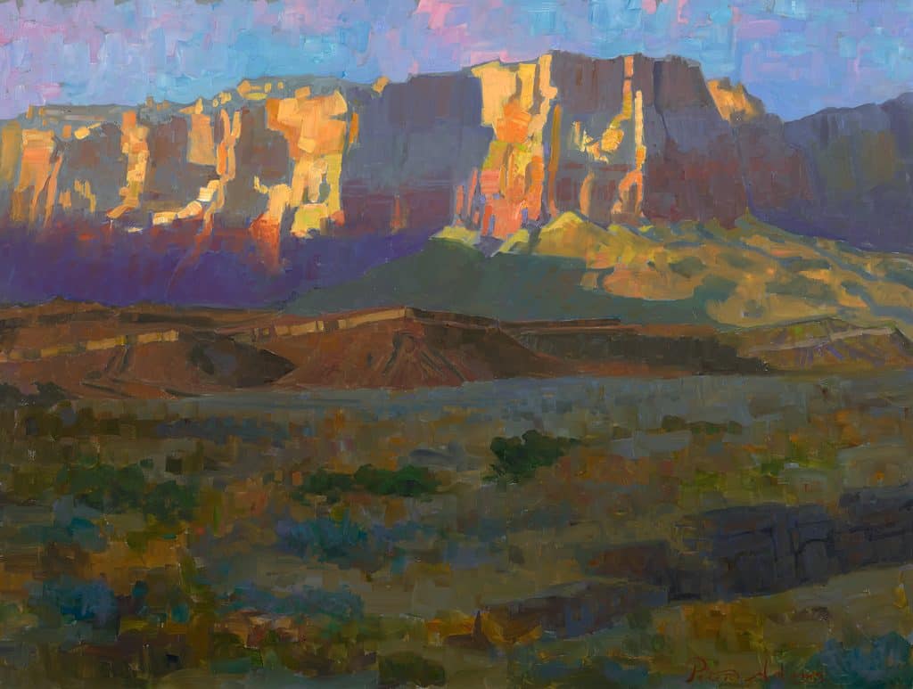 Description Desert Radiance was created during Peter Adams' 2016 plein air painting trip through the southwest. Struck by the area's warm colors and other-worldly landscape that was further intensified by the setting sun, the artist expressed his personal interest in interpreting nature's color, drama, and vastness. The result is a classic southwest landscape—a grand statement to freedom and exploration.