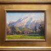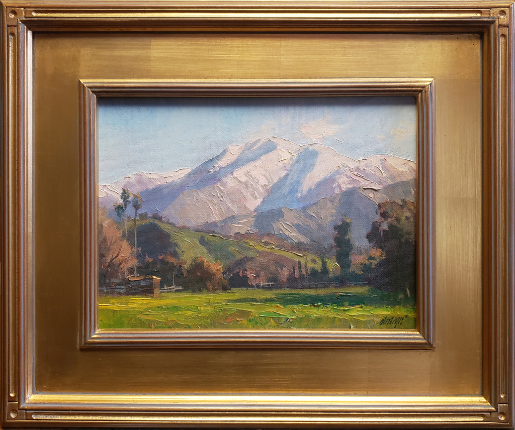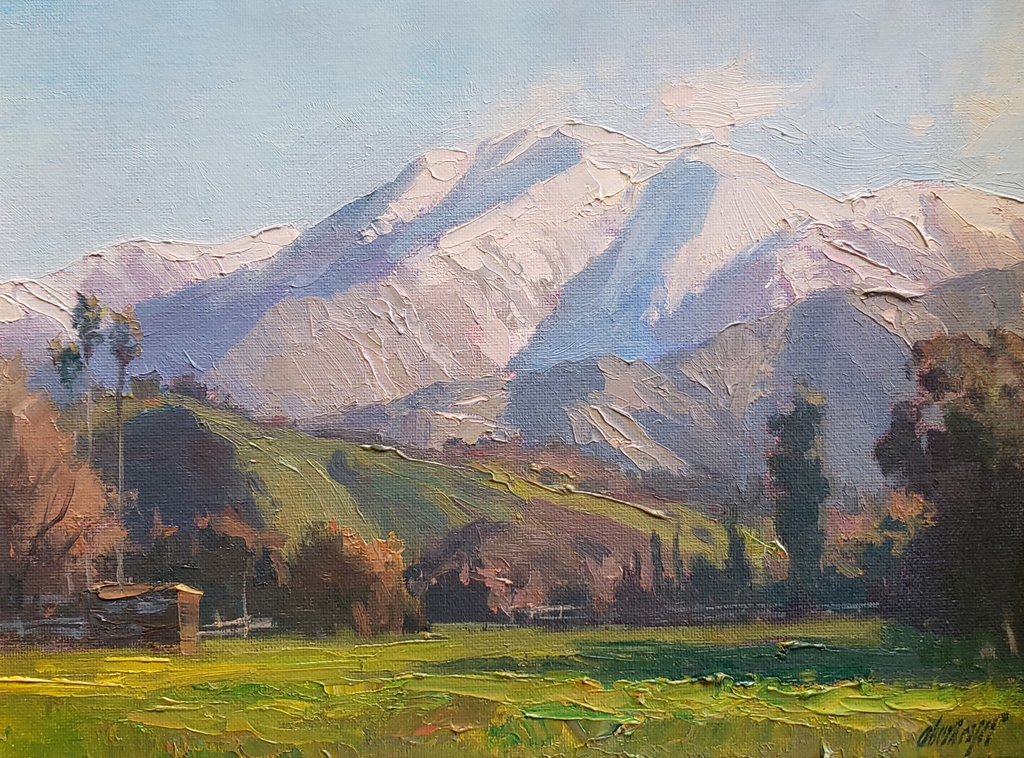 "With all of the snow in our local mountains this past Winter and Spring, as a plein air painter I couldn't wait to get out and capture the beautiful scenery on canvas. I found this perfect view from a farm near the campus of Cal Poly Pomona. It felt so 'early California' to me and it was a joy to paint!"