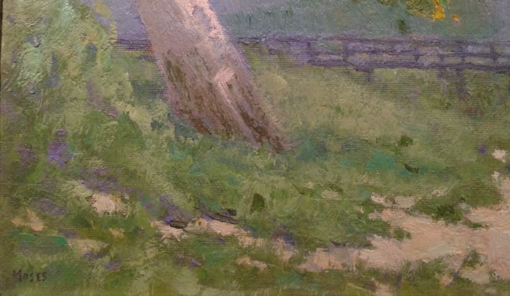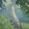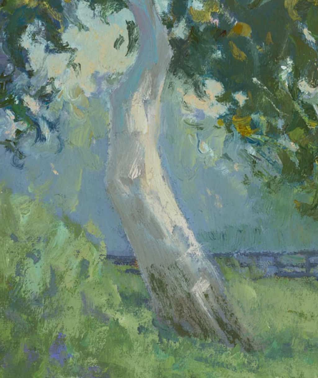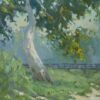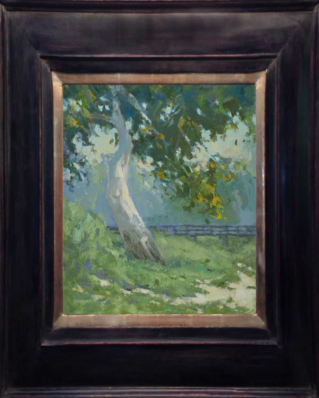 Painted at a private country club in Los Angeles, Down by the Sycamore offers an intimate glimpse of a golf course intended for members' eyes only. The angular shape of the sycamore and the various hues of green showcase the way in which the sunlight peers through the trees. In many cultures, sycamore trees mythologically represent the power of nature. As the light glows above the sycamore, one cannot help but feel awe-inspired.