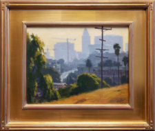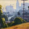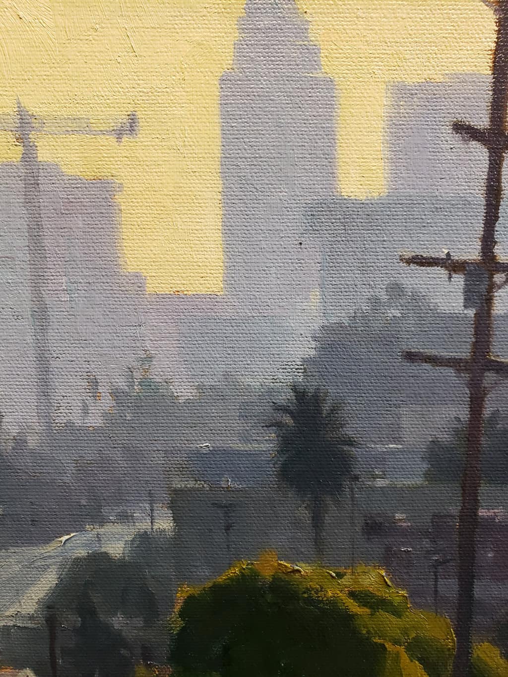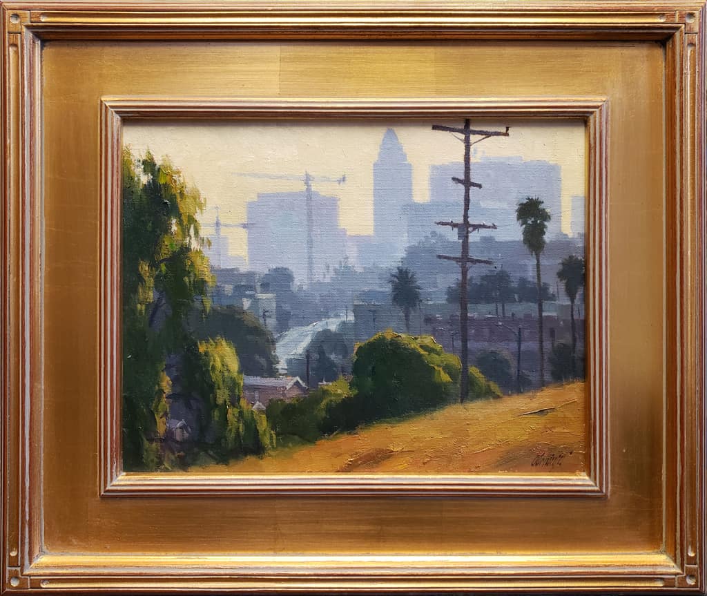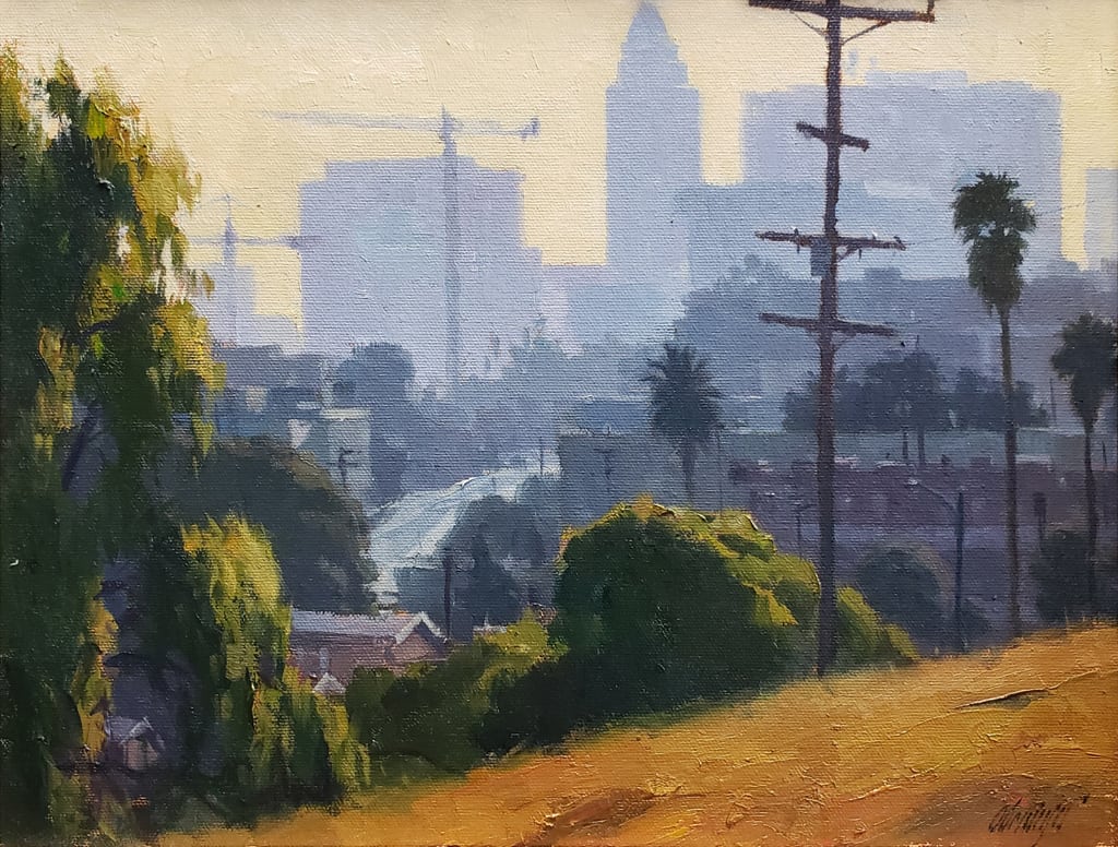 "Lookout Drive is a hidden little road below Dodger Stadium, a spot that I originally saw from the stadium parking lot. I love the contrast of the old grassy hillside and pepper trees, small apartments and power poles against the older buildings of downtown, including City Hall, on a quiet, hazy winter day."