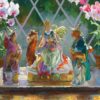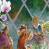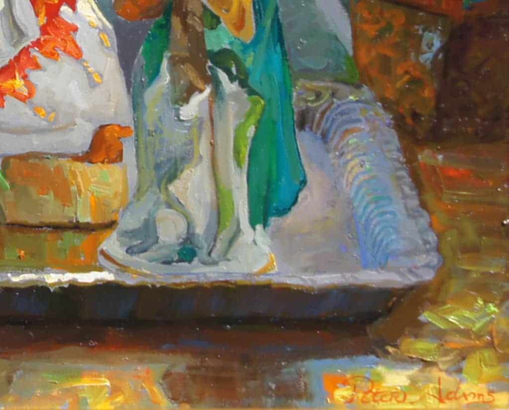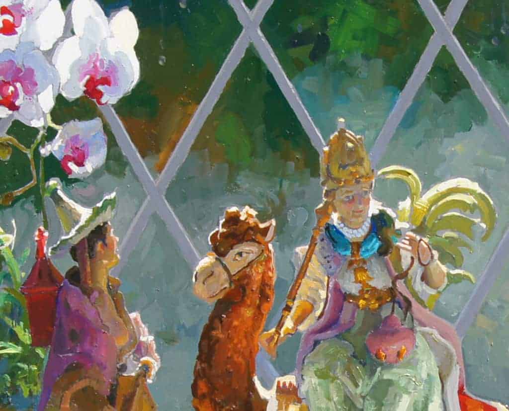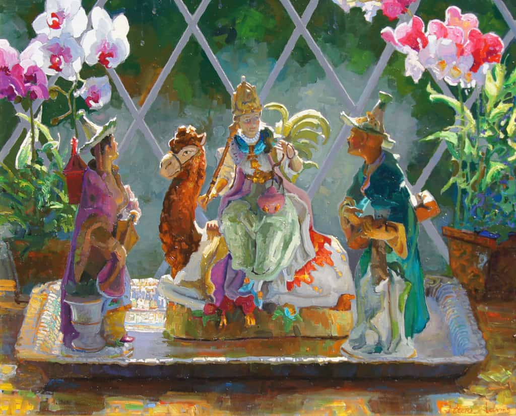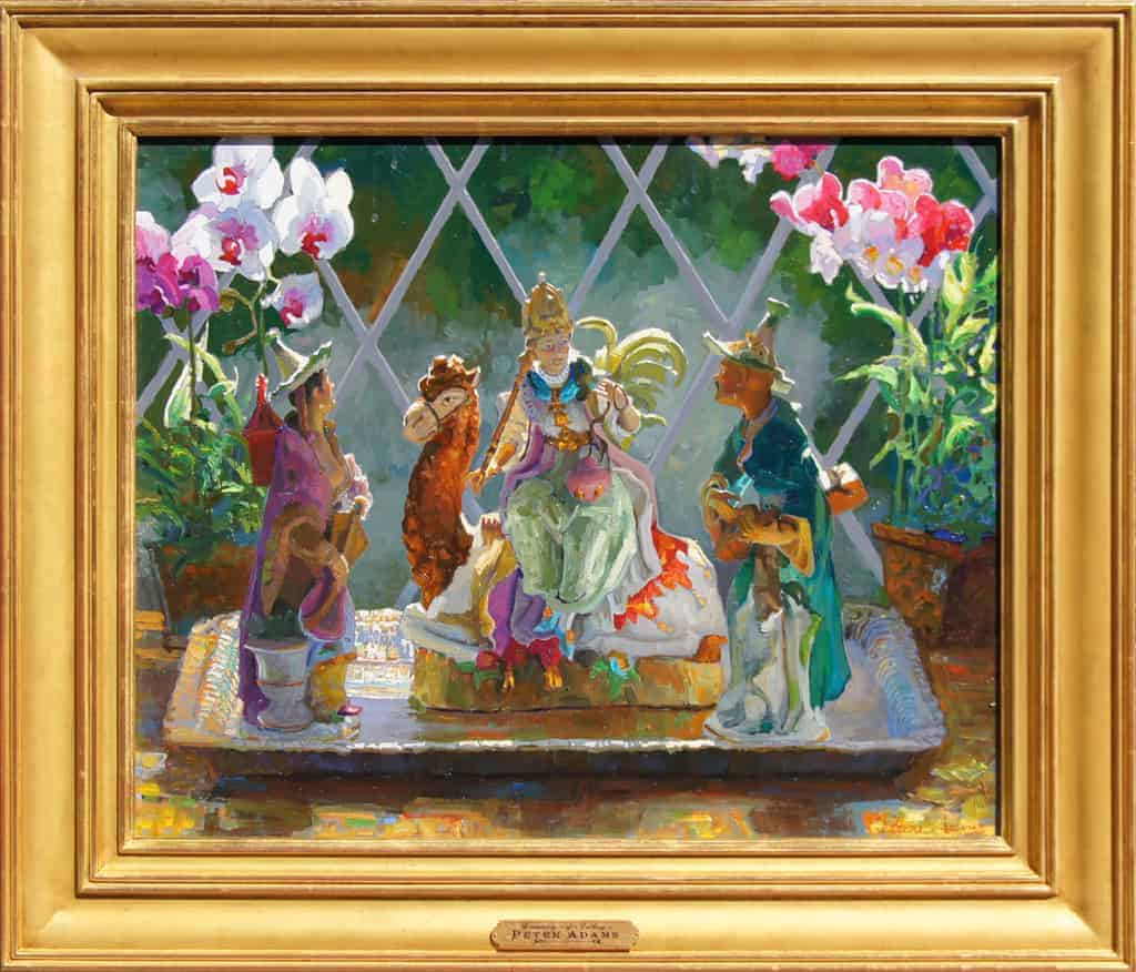 "This painting is based on three Meissen porcelain figures that represent the continent of Asia. The central figurine is actually entitled Asia Seated on a Camel and was originally designed by the Meissen factory’s top sculptor, Johann Friedrich Eberlein, in the mid-18th century. Behind the figures, the view outside the window indicates a stormy rainy day—just the type of weather that inspires daydreaming about faraway exotic lands."